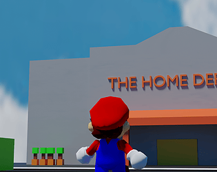 Mario needs to get to Home Depot, but a road blocks his way. He needs to walk past the road while avoiding cars to get to Home Depot. He walks in the door.