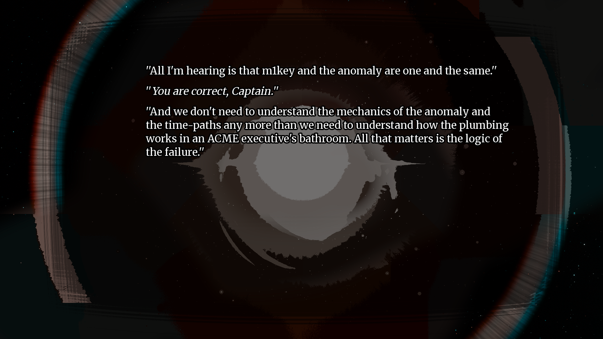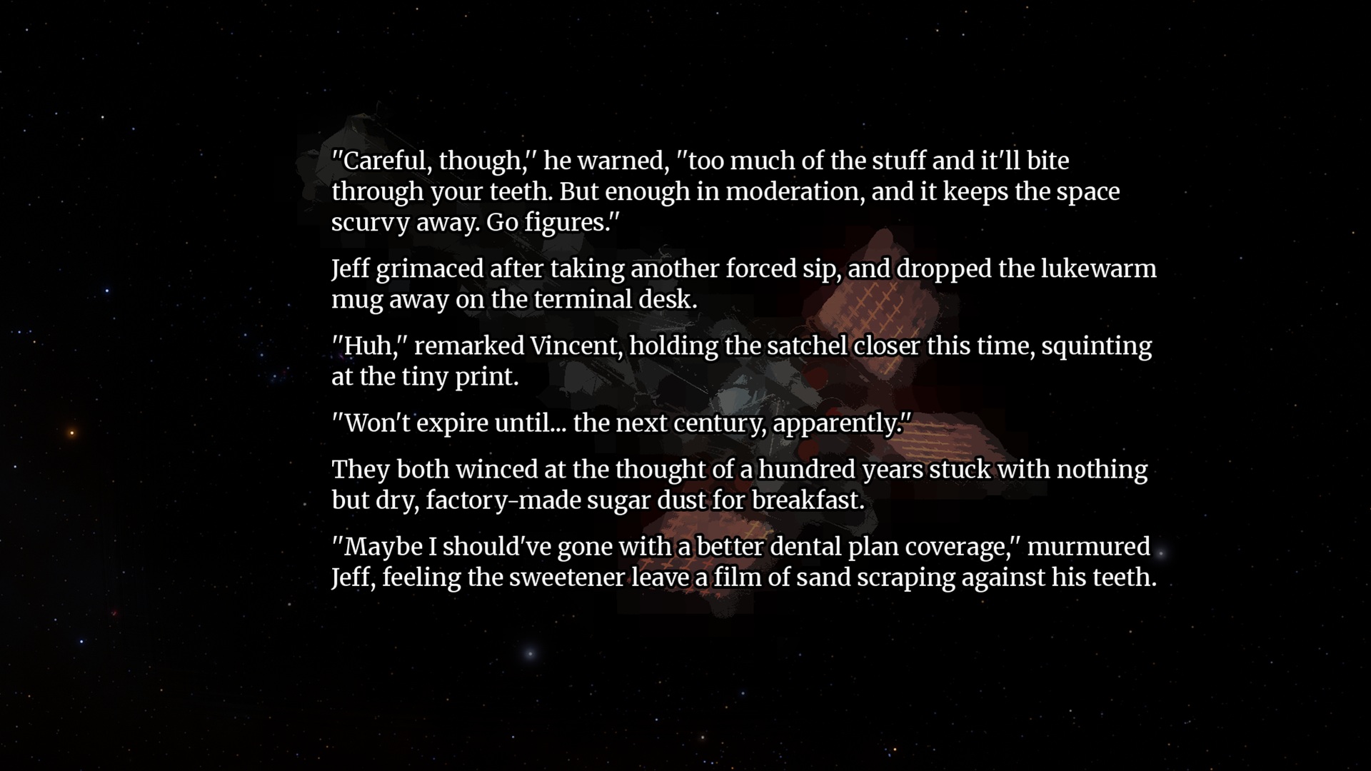 The story is told in two acts and ends with a short cheeky epilogue. It is entirely in NVL format, with royalty free music and SFX used for atmosphere. The backgrounds images were taken from Space Engine and were heavily edited with some fancy glitchy filters in GIMP software to polish the imagery into something more surrealist and pleasing to look at.