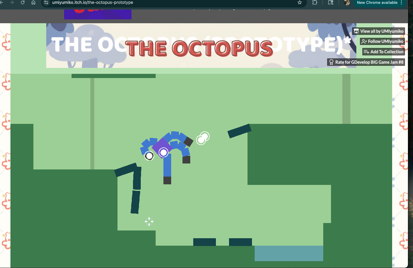 Nice game! I had a lot of fun playing it. It controls really well. I did wish there were some music or more interesting environments. Good interpretation of the theme, taking control of a difficult control scheme. I feel like a really got the hang of it as I played. I felt more like a monkey than an octopus as I had for arms and I was able to swing myself. Some checkpoints would be nice. I got killed by the fan and had to go all the way back to the start.