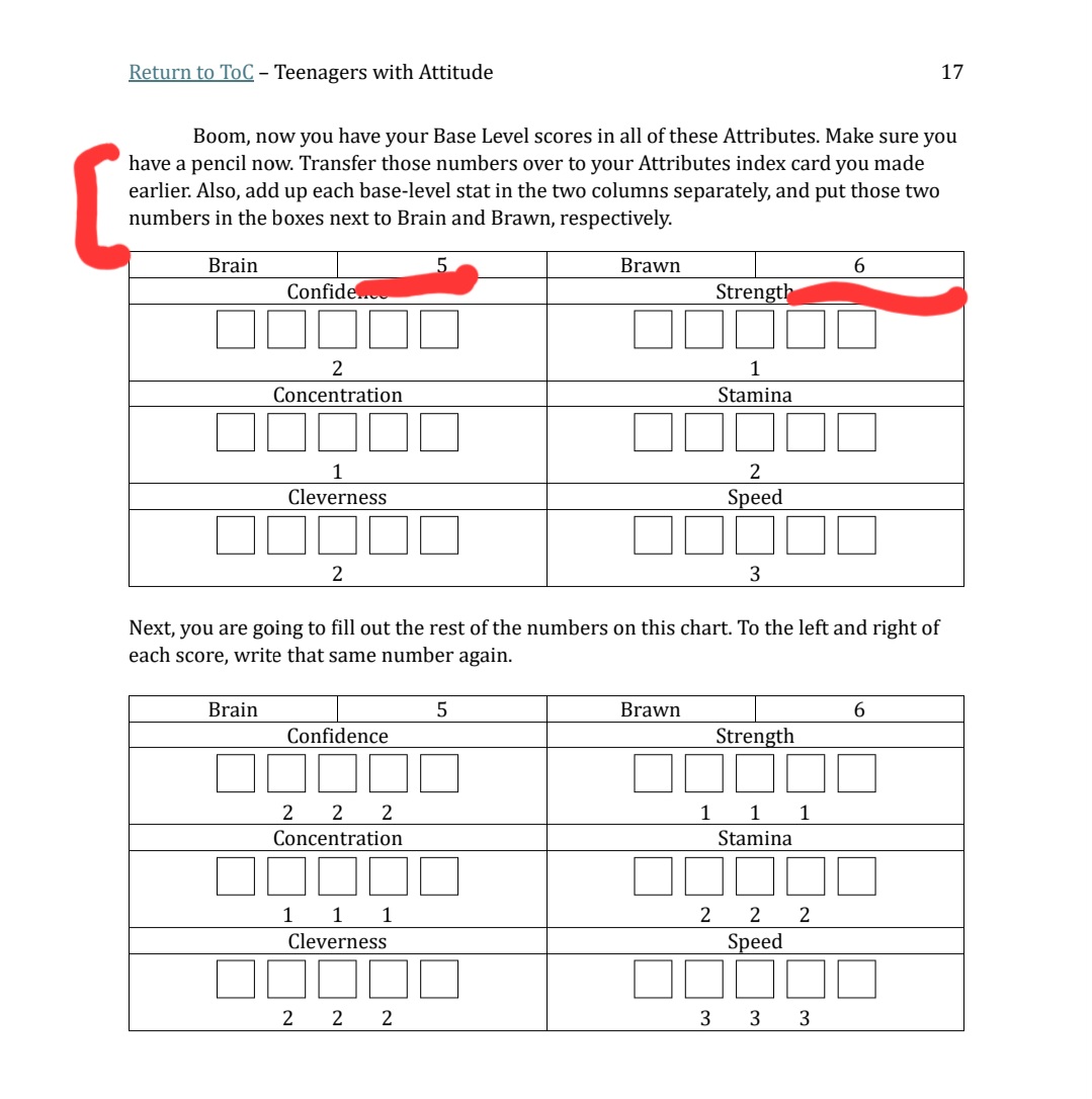 First, the boxes at the bottom. Those are the Brain and Brawn scores.