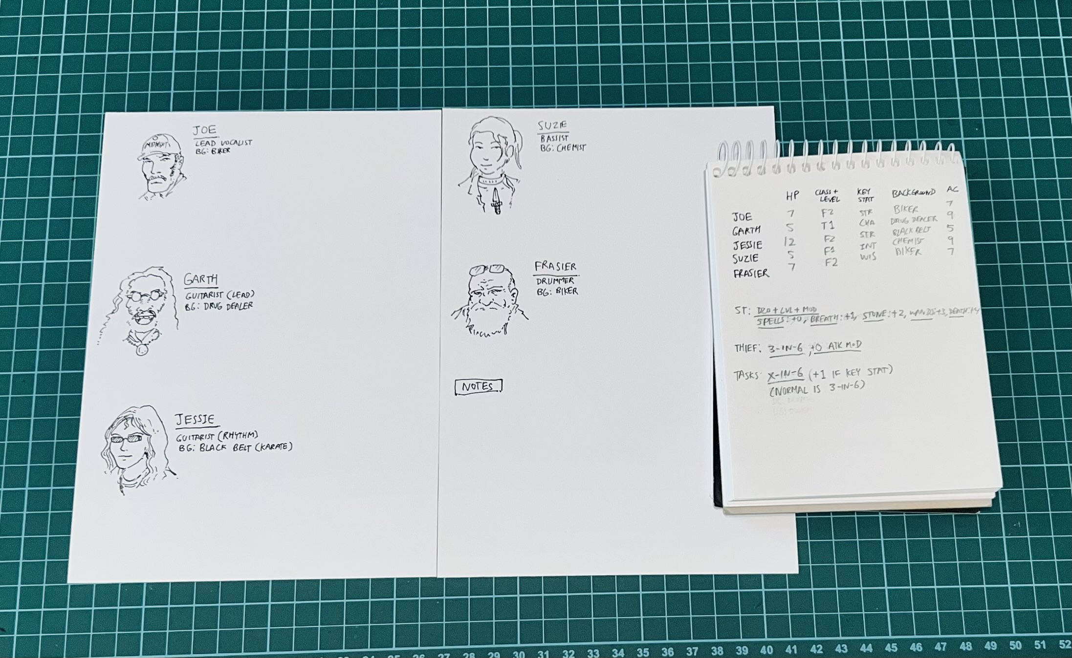 The party are members of the rock band “Rusty Gibbs and the Midnight Truckers”, being put up by Jenny Wicks in 5 Richter St: Joe (F2 N), Garth (T1 N), Jessie (F2 N), Suzie (F1 N), Frasier (F2 N)