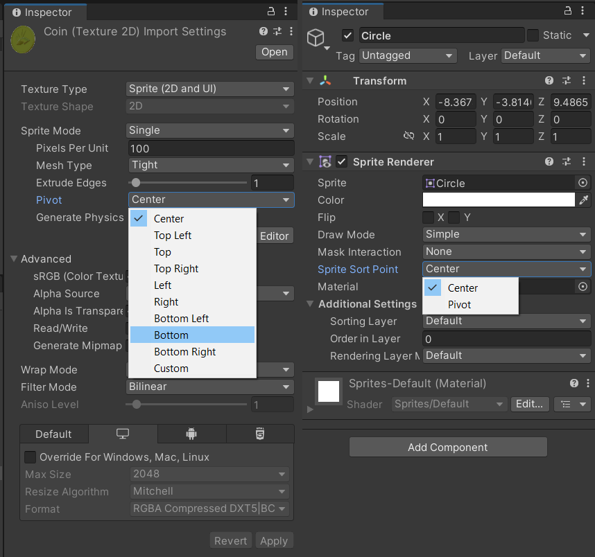 More specifically, in Unity (this is version 2022.3.28f1) - in the sprite renderer, change sorting to pivot. in the sprite importer (click on the .png itself in the project folder) - change the pivot, either using this drop down, or in the sprite editor. For the style you chose, using the bottom of your player would work well. although, in this case, you could also put things like the front door in a higher sorting layer, so it always shows on top of the player, and simply not allow the player behind certain items, like the auto-egg-maker.