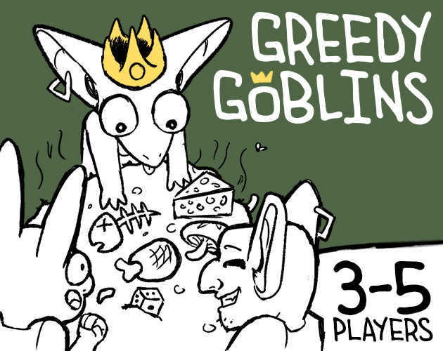 A dice-rolling party game for 3-5 players about a group of hungry goblins greedily arguing over how much food they've gathered and how much they can get away with taking for themselves, with the Goblin King not being too helpful at settling matters either!