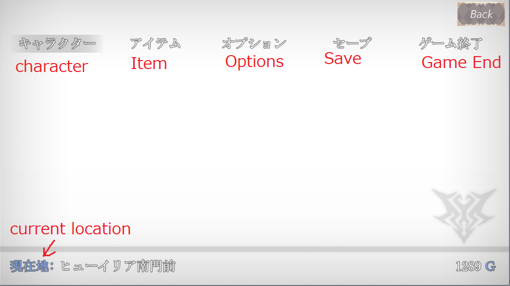 Here is a screenshot of the menu screen. Only the “Character” item is displayed, using the Japanese MenuSubCommand plugin and the SceneCustomMenu plugin. The text “Current Location” is displayed by the AltMenuScreen2MZ plugin. I would like both “Character” and “Current Location” to support language switching.