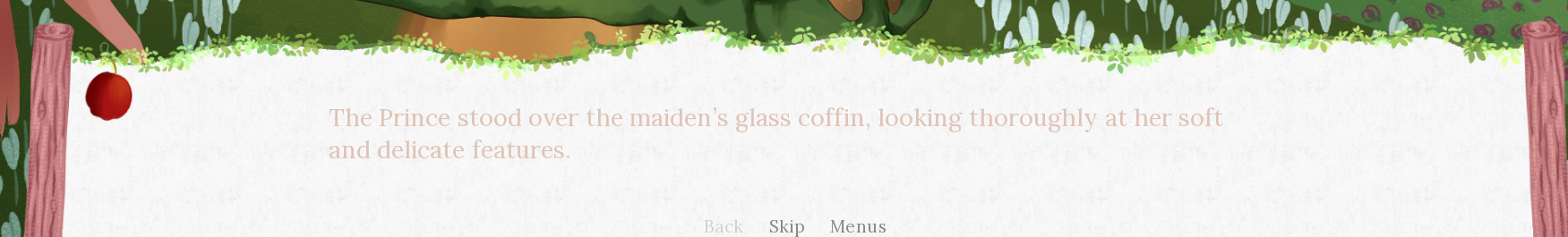 Of course, for Once Upon A Time VN Jam, you are not expected to make your game with only one sprite, one background, one music track and in less than 1,000 words, but keep in mind that you don't want to overwork yourself and that fairy tales were short stories, since they are meant to be told rather than written: you can do something short which is in-theme!