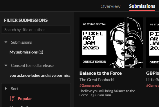 And if you go to the submission page https://itch.io/jam/gbpixelartjam25/entries you should see you have a "My Submissions (1)" link: