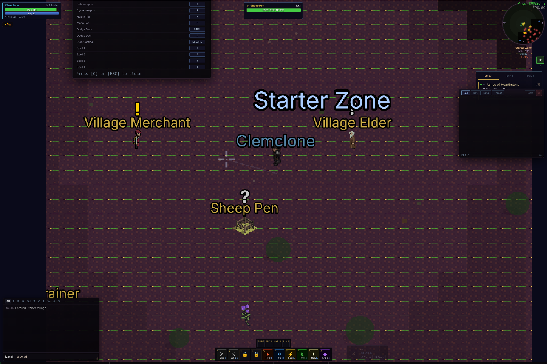 So there's giant labels all over, some concealing content. When I (Clemclone) click the mouse I jump and do something, but I can't tell what because I jump *under* my own label. Cursor is the crosshair but there's a faint line stretching from it to somewhere below my feet. Glitchy horizontal lines all over everything. Interface widgets all much too small and their text is miniscule -- and this is after I maxed out the font size... but that only applied to the labels, I think. And then the settings window said I could do O or ESC to close it so I tried ESC... which at least at itch.io pops you out of fullscreen, causing a reshuffle of UI widgets, leaving the settings window halfway offscreen and I couldn't figure out any way to get it back.