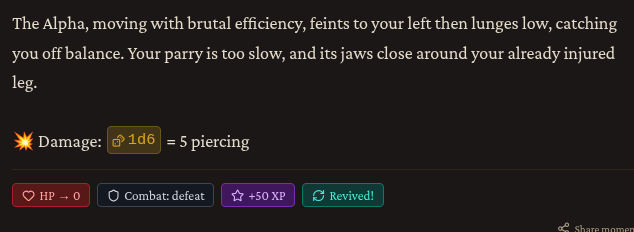 Otherwise, my first run is interesting but confusing, maybe because I started it with no Narrative information. I have a strong impression that it's making up all the action as it goes along, rather than maintaining a world that I'm acting in. I've started a second and loaded it with Discworld (https://discworld.fandom.com/wiki/), and it's doing quite well at Pratchett-like prose and setting. So far this world seems more solid. I started this one with D&D rules; so far I don't notice much difference.