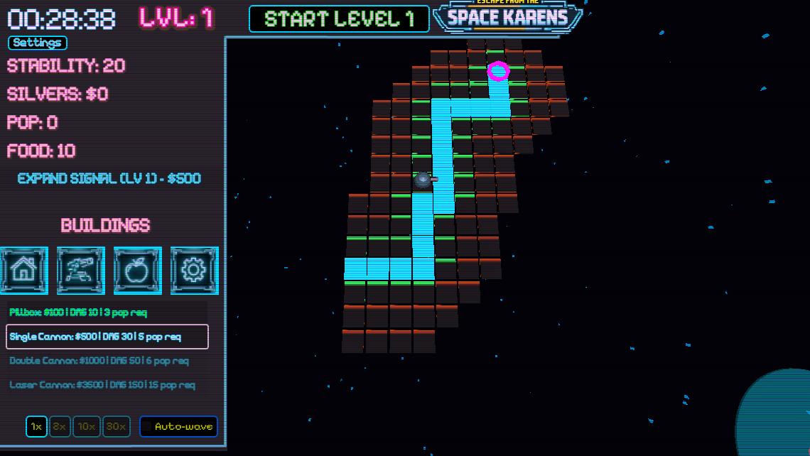 This was a 7 day build. Its just a little resource management Tower defense game. Try it out and leave a comment! https://clockworkindusties.itch.io/escape-from-the-space-karens