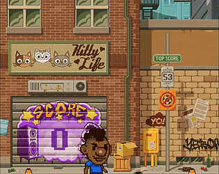 Its a simple skills game about timing and dodging errant cats XD the background also serves as the UI so the menu can be opened through the pink sign towards the top.
