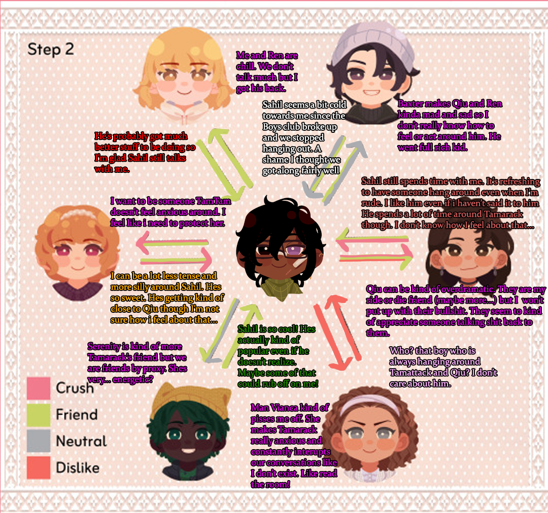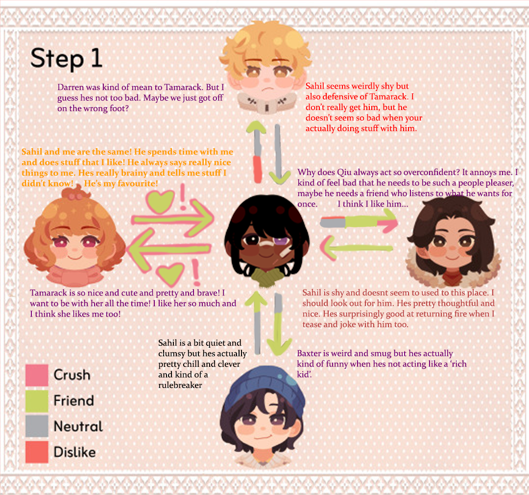 Throughout Step 1 they quickly became best friends with a mutual crush as the unpopular new kids with Tamarack being loud, curious and energetic, and my MC being almost silent but very level headed, cautious and stoic. Perfect partners in crime.