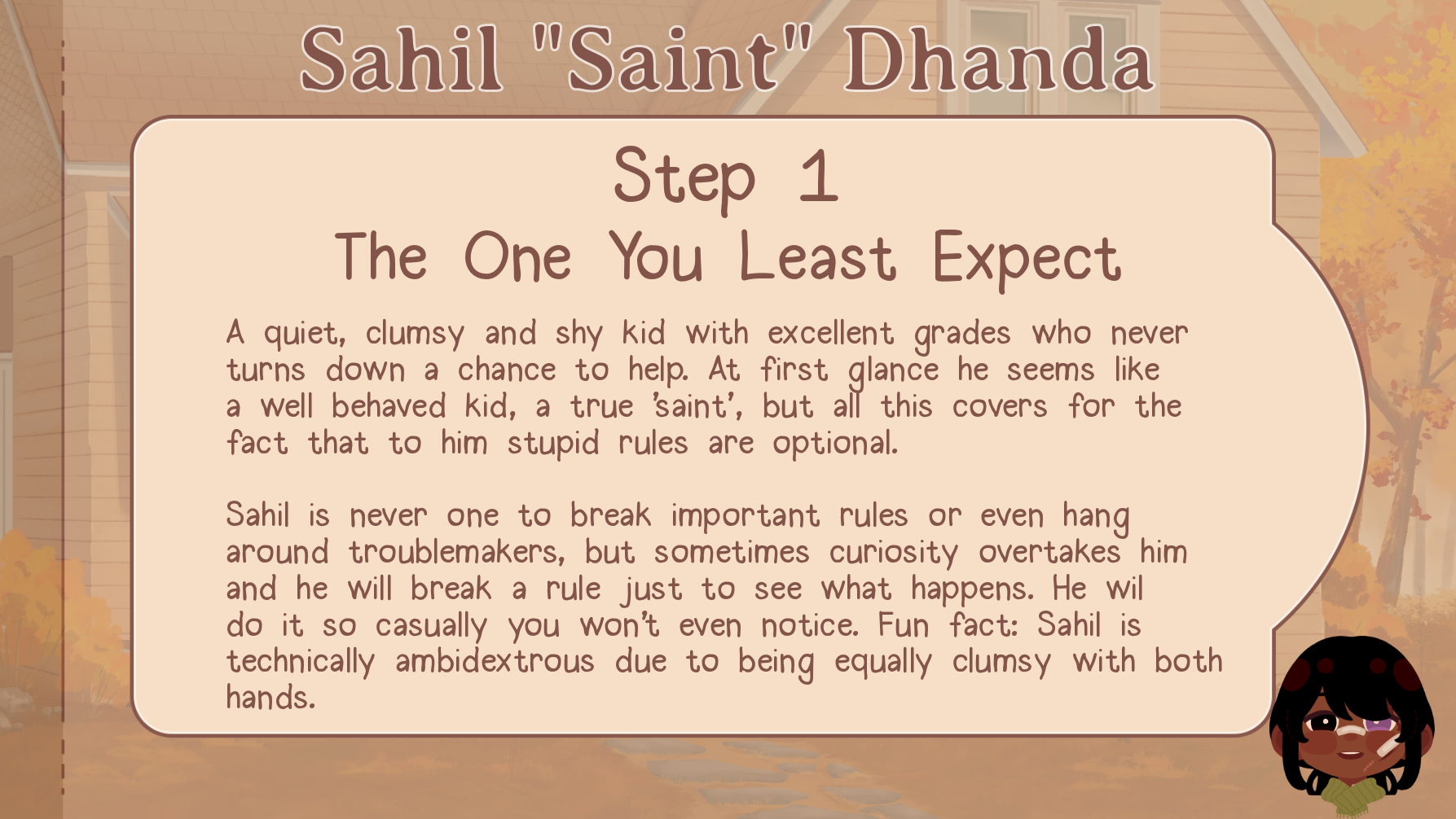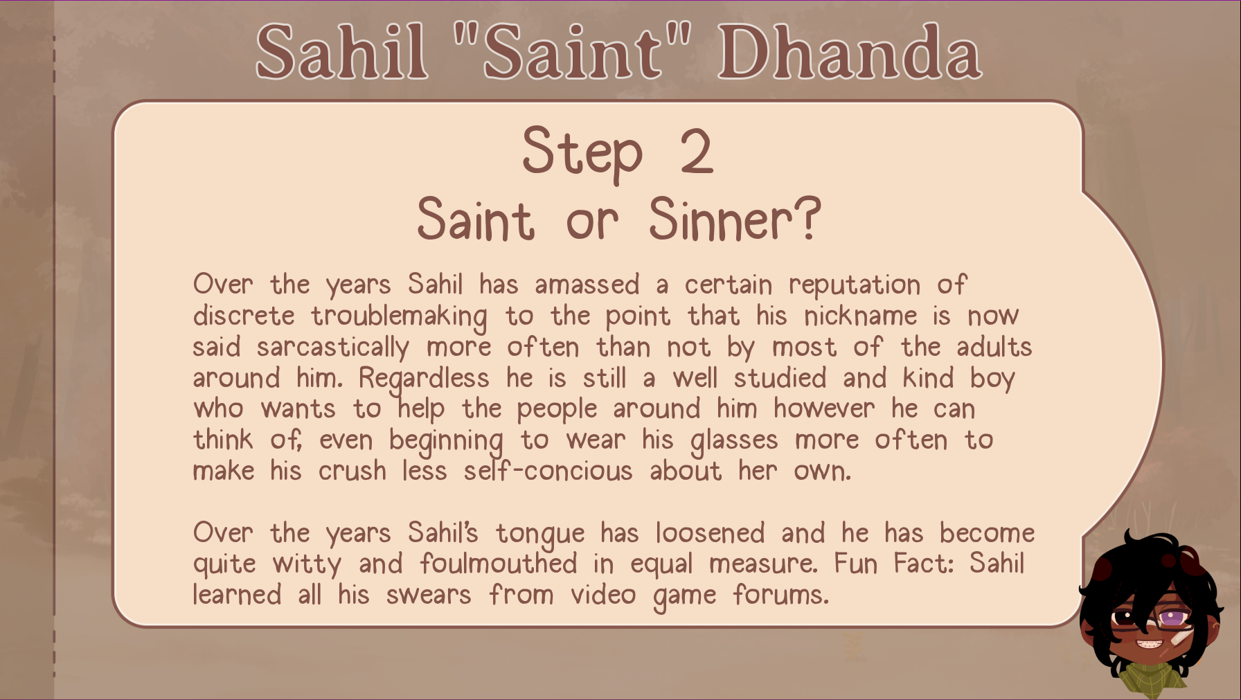 From the start of step 1, Sahil is a big nerdy nerd and would rather read books than do anything physical (mostly due to being extremely clumsy and uncoordinated leading to many injuries). He only ever does physical stuff due to either Qiu ragebaiting him or Tamarack inviting him.
