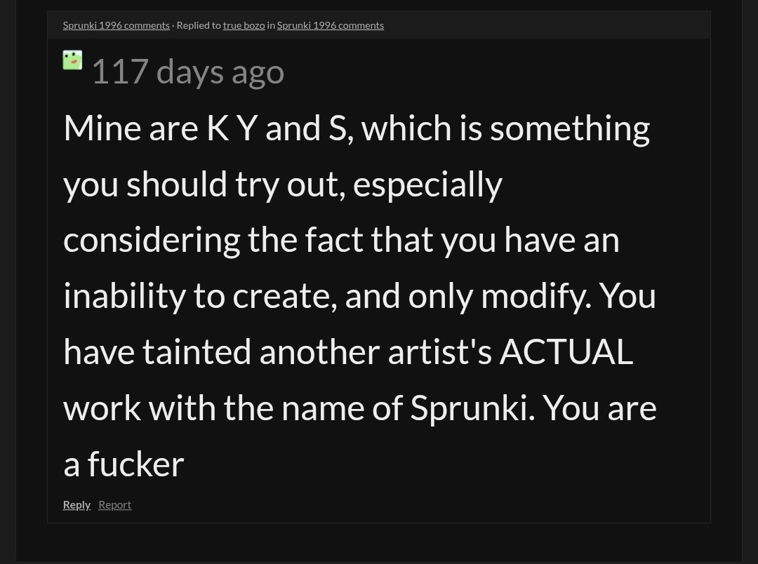 Sprunki - ANOTHER PRETTY INTERESTING BUT STILL BORING FUCKING SPRUNKI MOD comments · Replied to Andrew in Sprunki - ANOTHER PRETTY INTERESTING BUT STILL BORING FUCKING SPRUNKI MOD comments