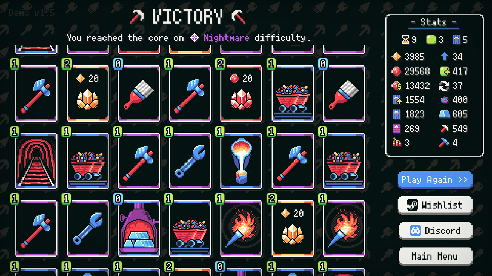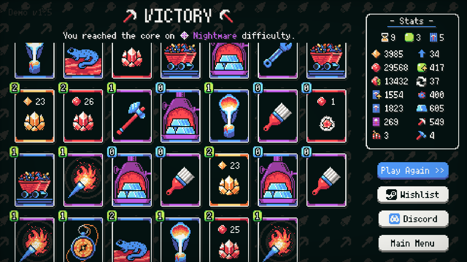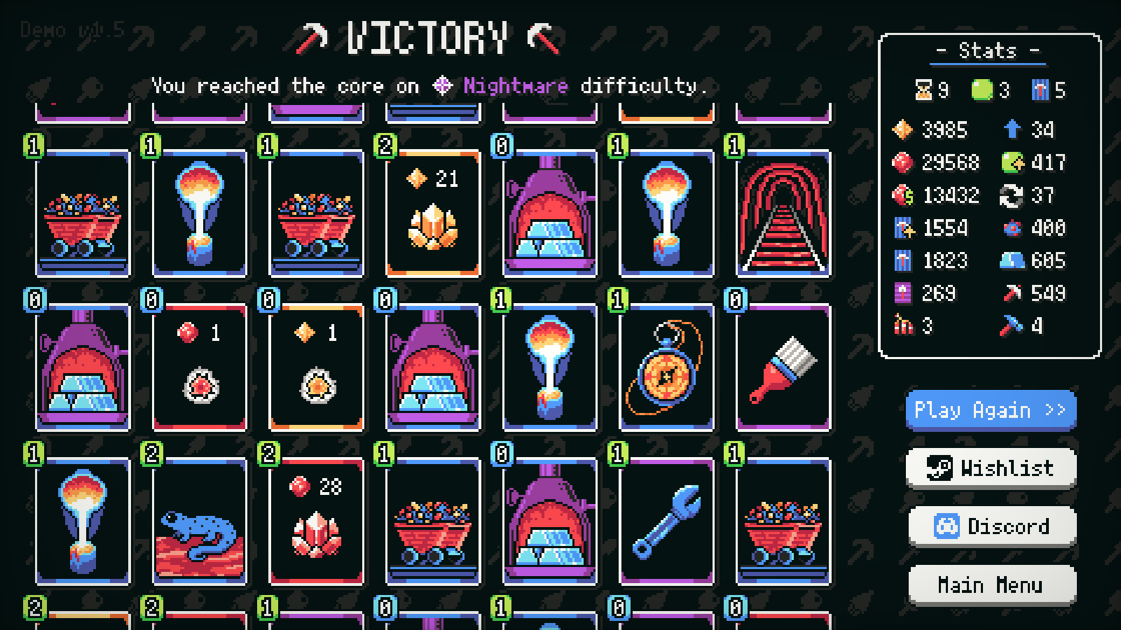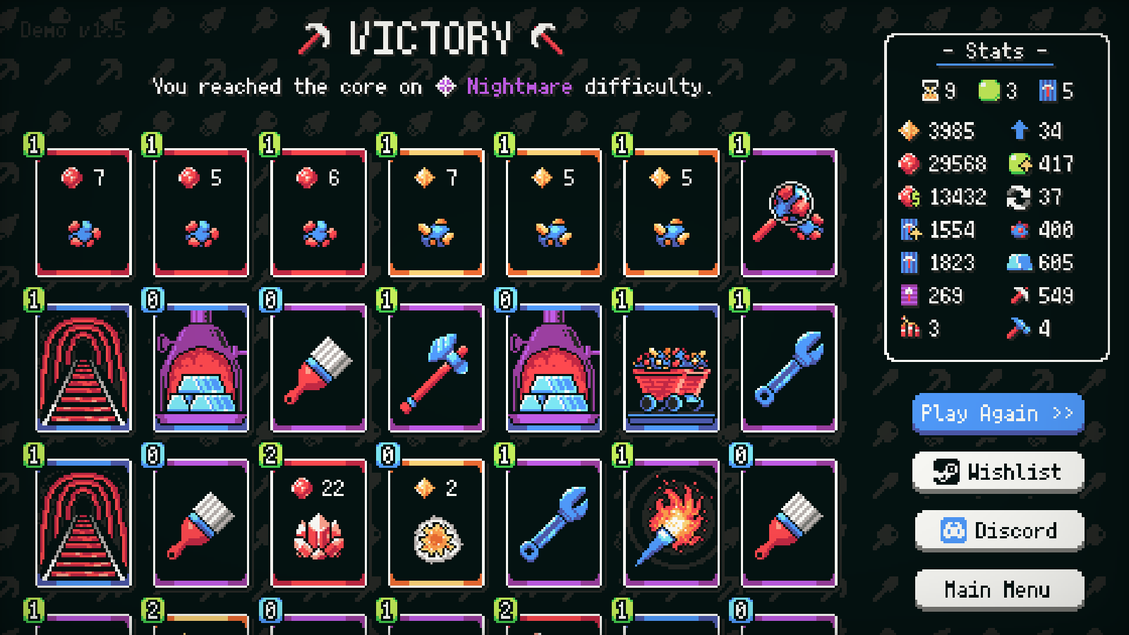 First time trying out cube, to be honest i think cube is kinda meh even though i won with it I feel like overall its kinda weak because to work it needs tool support and other ores have comparable upsides or are better ( the +1 per upgrade seams to be similar numbers while not needing tool support, score pando has ore that also kinda scales with it, kaz support is stuff you basically always want anyways meteors and geodes and draw). Drill theoretically has good synergy with it but every time you use it you arnt going to have energy to upgrade the cube and feels bad to not upgrade it and also has its on energy issues that are harder to resolve because you cant cheat it out with a tool so you basically need a super thin deck or get really lucky with the most expensive card in the game? minecart. Corkscrew in theory works well with it to but corkscrew feels to similar to prospect for me to really want to add it, and seams like it would make prospect turn into a brick knowing theres a better version in my deck