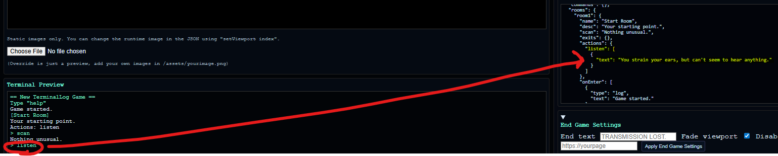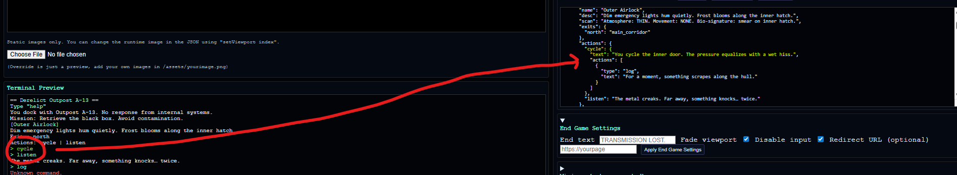Hi! I'm trying to get through the Basic Guide, however I seem to be having an issue with some of the actions. Despite not editing the JSON at all yet, certain commands (such as "cycle" in this example) simply aren't working, while others (such as "listen") are. This issue continues throughout different rooms, where one action works while the others merely do nothing.