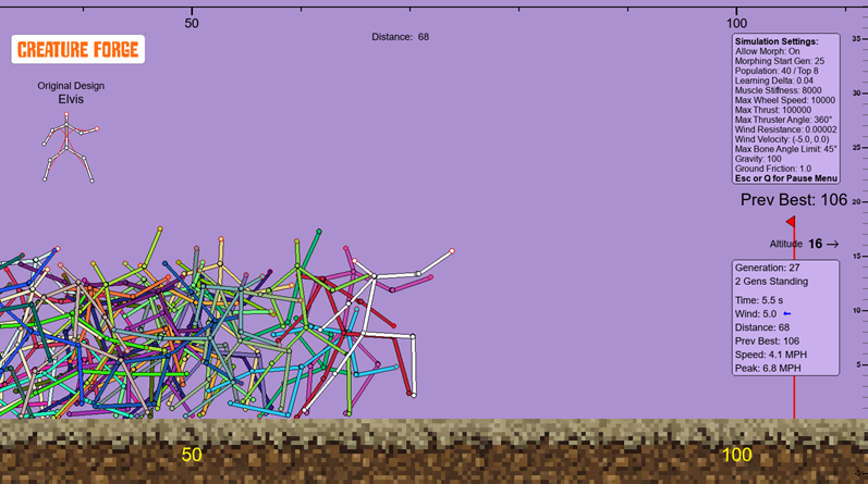 Brief Summary: Design and Evolve bizarre creatures from bones, muscles, wheels and rockets, then watch generations of neural-network-controlled offspring learn to race across a physics world. Creature Forge lets you hand-craft weird biomechanical monsters with AI-controlling neural networks, tweak gravity/wind/friction/thrusters and many other variables, then watch natural selection turn your awkward first designs into surprisingly capable (or hilariously disastrous) racers. Morphing Mode: Bones stretch/shrink and wheels resize via tiny mutations, turning your rigid blueprint into wildly adaptive mutants.