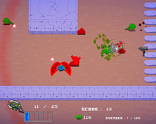 Simple top down shooter game pattern. Find weapons while fighting enemies. More weapons = More enemies.