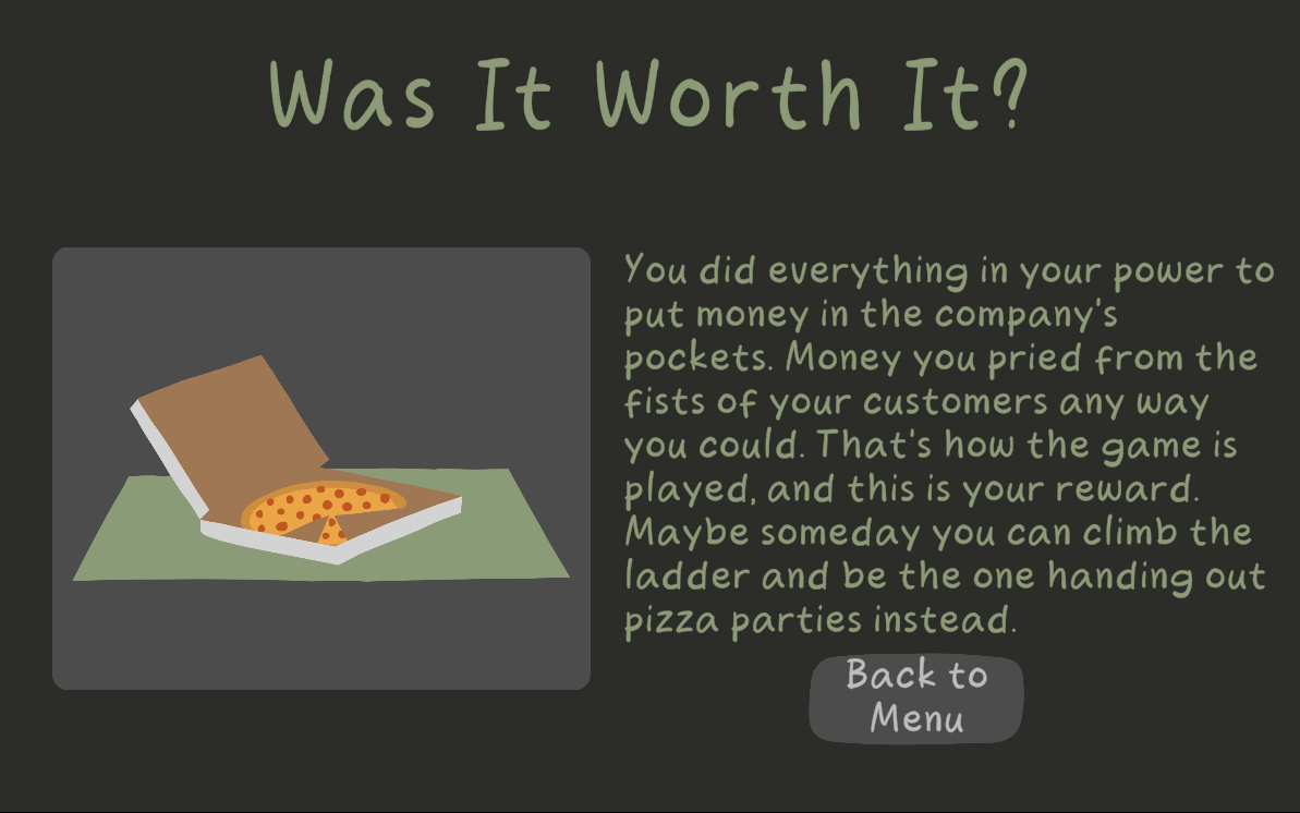 The main conflict, which is being generous or not getting fired, is not sold to me emotionally. I was going through the motion, doing mental math at calculating what's the expected price, but starting from Day 2, I just started to ballpark and rounded up, up-charging people to keep seeing the consequences of my actions. I felt like, whatever I did, it didn't make a difference in myself, my spider boss, or any customers that came. For example, there was a customer that said something like, "I'm not paying for this!" and they still paid me.