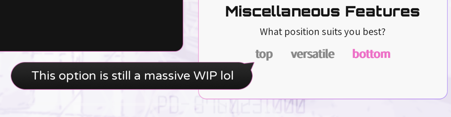 Also... I know you're aware of this and have acknowledged it (thank you!!), but I do want to gently remind everyone else that the DLC is still a major WIP, as noted on the Itch page. I wouldn't want to mislead anyone, make them believe that the position variants are without fault, or give the impression that the current state of the top variant is final!