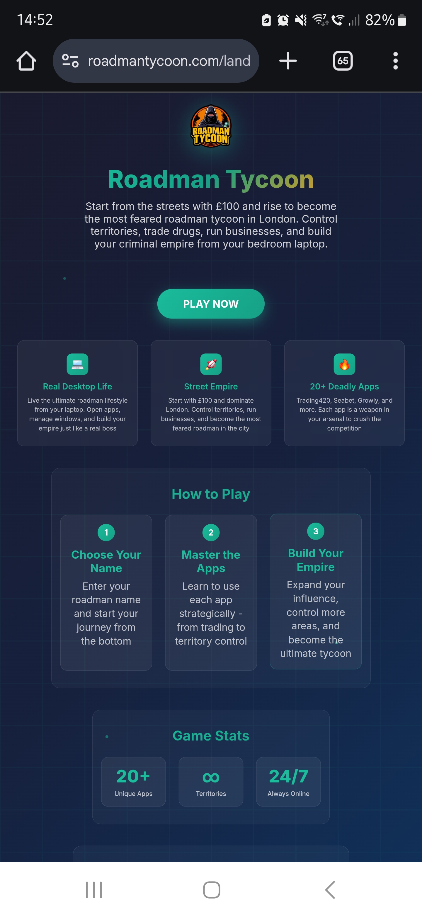 Start from the streets with £100 and rise to become the most feared roadman tycoon in London. Control territories, trade drugs, run businesses, and build your criminal empire from your bedroom laptop.