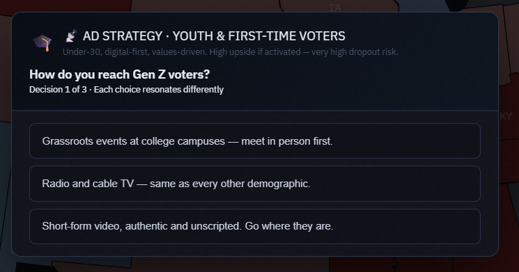 If you perform well in the rally minigame, the crowd response will translate into a real polling boost in that state. A great rally can now visibly shift the race.