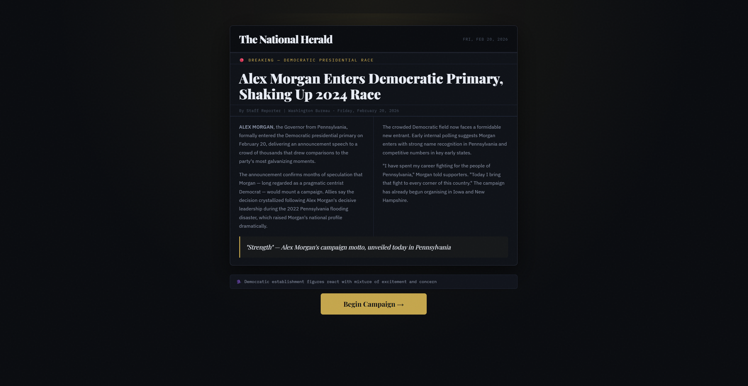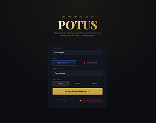 POTUS — Presidential Election Simulator puts you in the heart of American politics. Build your candidate’s backstory, battle through the primaries, survive the convention, choose your running mate, and fight for 270 electoral votes. Manage funds, momentum, media, and strategy week by week as scandals, debates, and breaking news shape the race. Every decision matters on the road to the White House.