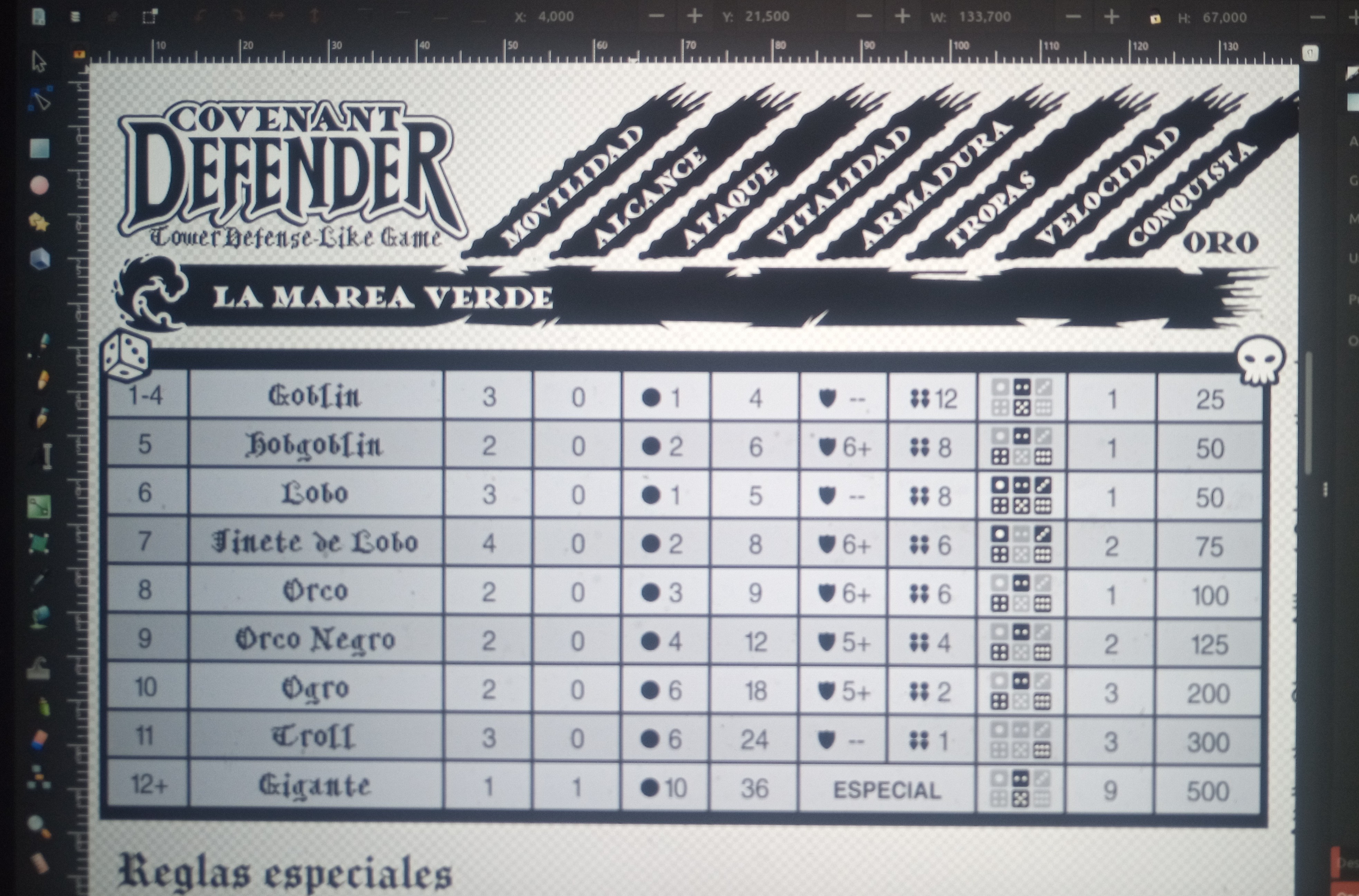 Estoy desarrollando "Covenant Defender", un wargame de tablero inspirado en el género de videojuegos "tower defense" y con un cierto regustillo "rolero" (aunque las reglas son muy sencillas).