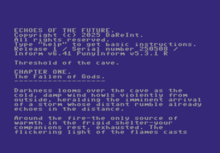 Echoes of the Future is an interactive fiction adventure written in Inform 6 using the PunyInform library, specially designed for 8-bit computers and retro systems such as the Commodore 64.