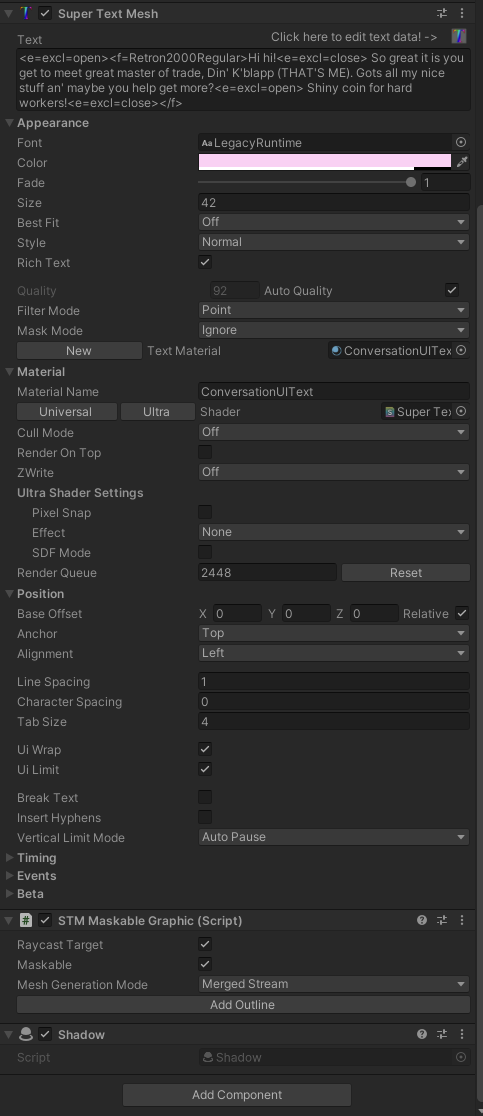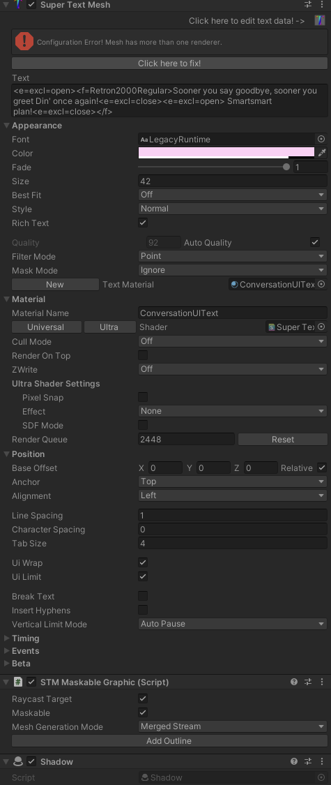Heyo! I just upgraded to the latest version of STM, and overall, it's running better than ever at this point! There's one problem that I'm running into now that has me really scratching my head, though. Dropshadow (and outline) do not really function for me at all at this point. Dropping all the details I can think of below. Please let me know if there are any other details I can provide! At this point I am using the URP for all rendering, although I have details/results for multiple different shaders below. The Render Queue setting is nonstandard, but the outcome is the same even when set to 3000, as it typically would be. (I am breaking this into multiple posts because the forum keeps giving me "missing token" errors when I try to post anything larger...)