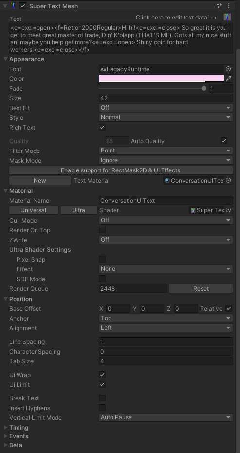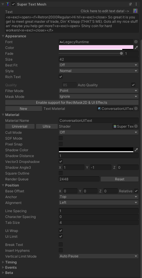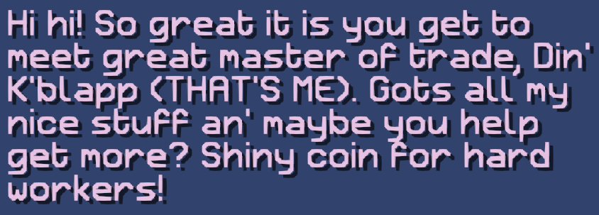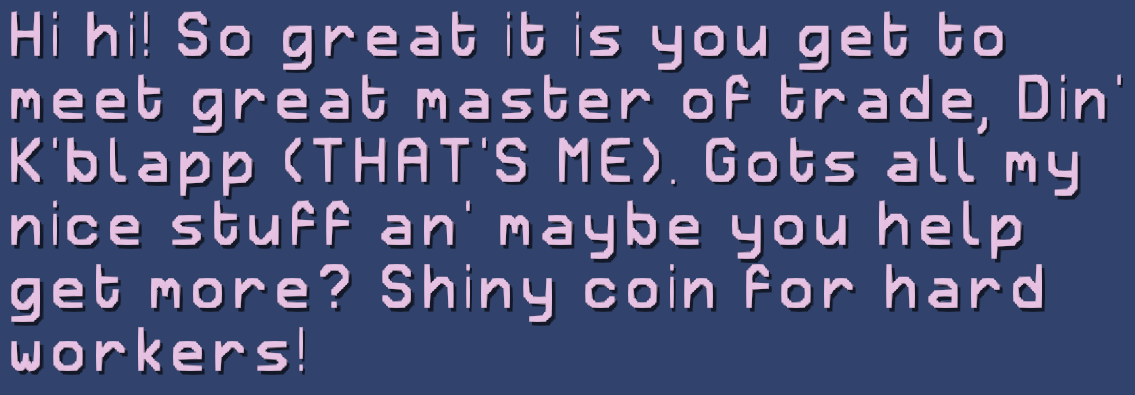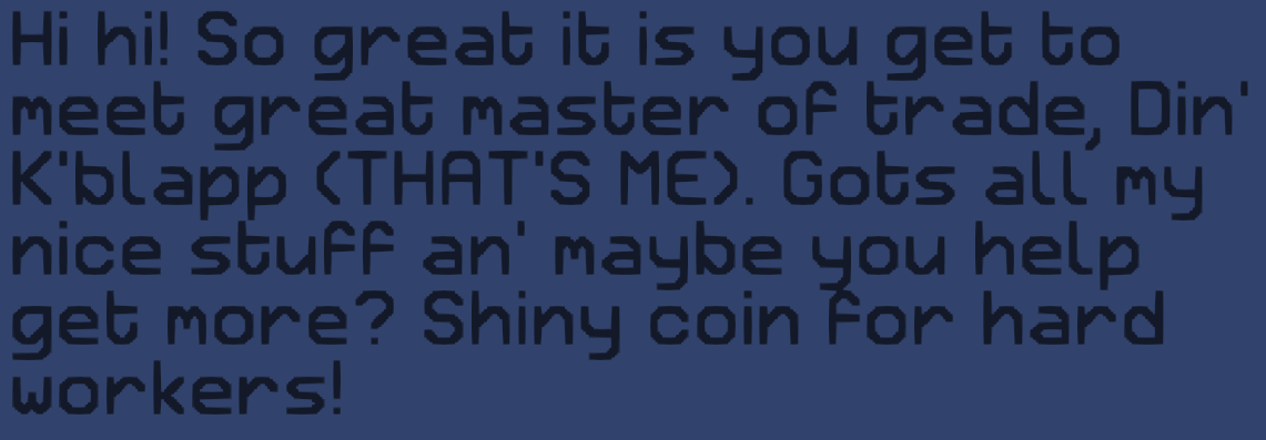 2) Set the text to "<e=excl=open><f=Retron2000Regular>Hi hi!<e=excl=close> So great it is you get to meet great master of trade, Din' K'blapp (THAT'S ME). Gots all my nice stuff an' maybe you help get more?<e=excl=open> Shiny coin for hard workers!<e=excl=close></f>" (obv the font name should be something you've got)
