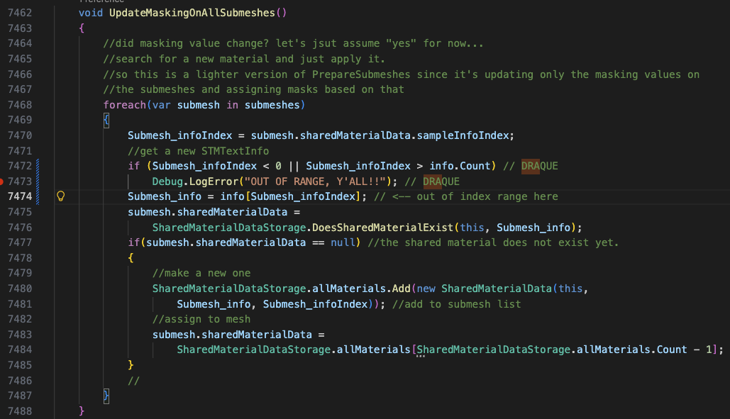 Ok, I am having trouble recreating this exact scenario, but the line it happens on appears below. I think this is a super edge case when materials are hot-swapped and the info member of the SuperTextMesh class is not updated in time for the call. If it fails once though, it seems to block the update happening later, as it kills the call from RecalculateMasking() before AppplyMaterials() can be called. I'm not sure whether it would work to simply return from UpdateMaskingOnAllSubmeshes() here, or if that would simply push problems downstream.