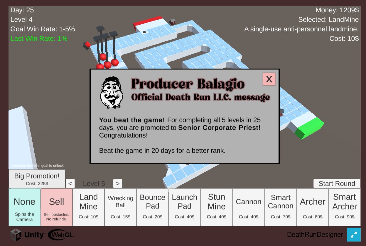 I spent about 5 days in Level 1 so that I can finish Level 2 with no penalties (Day 1-5). Then one shot Level 2 (Day 6). then played again to get more money to one shot level 3 (Day 7). However, I failed to one shot it and lost a day and had to play again losing another day (Day 10). Then I failed to one shot level 4, but did it in the 2nd try (Day 13). However, all of my hard work was ruined by having to repeat Level 5 five times and having a random failure twice in other Levels (Day 25).