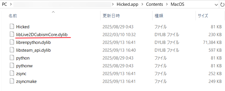So the file libLive2DCubismCore.dylib is actually in \lib\mac-x86_64 ...And the game actually did open but seems like somehow they couldn't find the file. Maybe try copy the file ' libLive2DCubismCore.dylib' then paste it under the folder \Hicked.app\Contents\MacOS ?