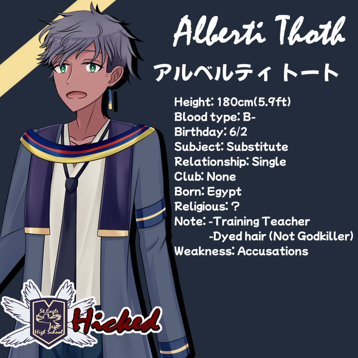 Alberti Thoth, a trainee teacher from Egypt who has dyed gray hair. His Japanese is not as fluent since it's not his first language. He is majoring in human science and mainly studies about godkillers. Students often call him 'Professor Thoth'.