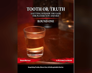Tooth or Truth is a fictional drinking game designed to encourage deeper roleplaying, more character investment and interaction, and develop and strengthen bonds between characters and players alike. With 25 new questions, 2 new variants, and the ever-present threat of swallowing the tooth, this GM-less roleplaying supplement offers both veteran and newbie players a way to create more meaningful in-game relationships for a richer and more fulfilling gaming experience. Perfect for Session Zero, down-time between sessions, welcoming a new player to the table, or exposing the perfect plot threads to pull, Tooth or Truth: Round Two is a great way to bring everyone's backstories up front!