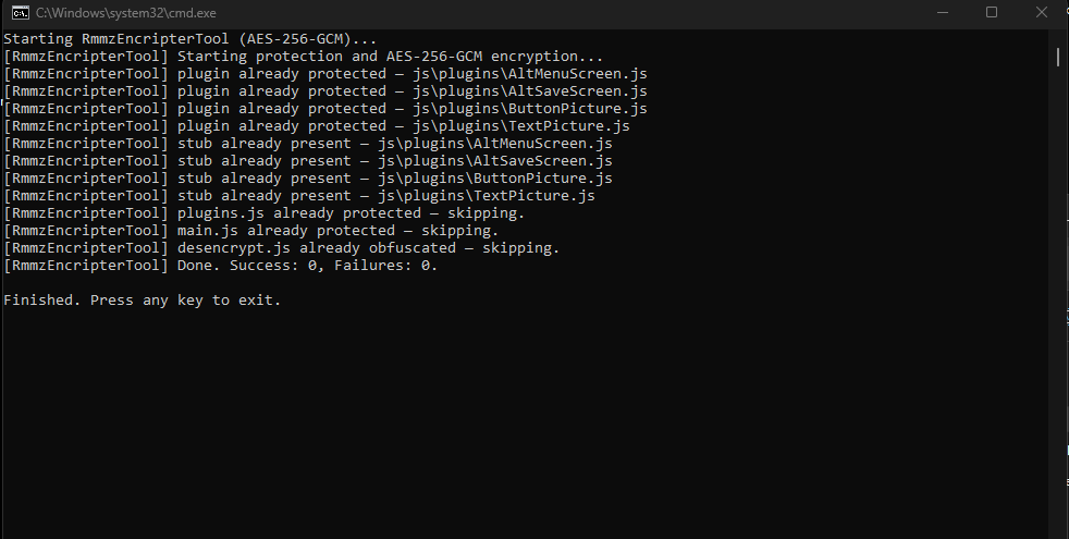 - Encrypts your RPG Maker MZ project assets with AES-256-GCM.