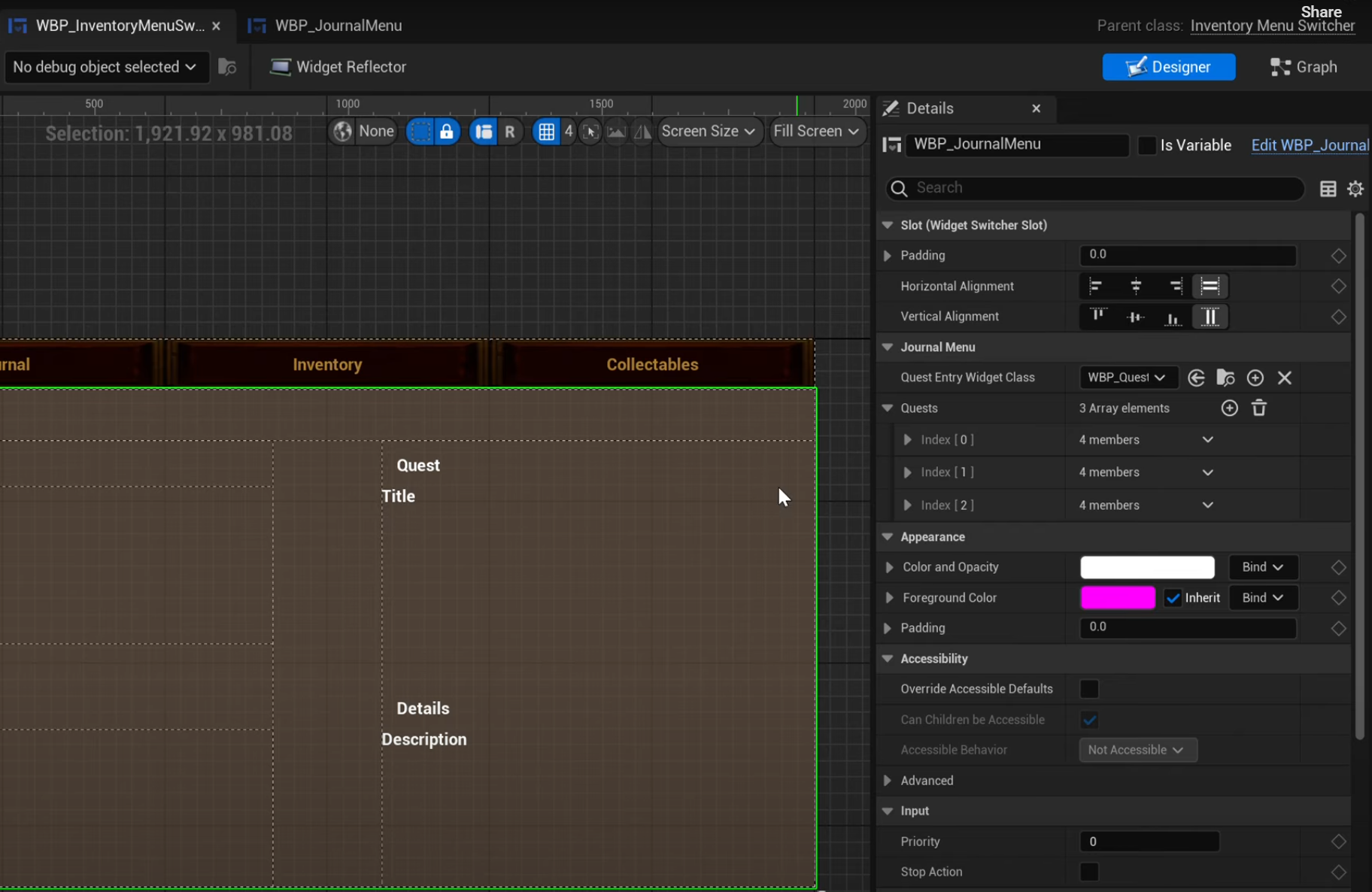 In order to resolve this, I began debugging the quest saving code to see where the array was being saved or over written. This helped me to find that instead of trying to rebuild the quest array during the save process, we could simply store the existing data in the array directly. By preserving this array as it was made, Unreal was able to correctly read the Blueprint created quest and restore them more accurately. I added a dynamic function to check for a refreshed list so that the quests set in Unreal could be dynamically refreshed to the list before the game even starts and the player can access that menu.