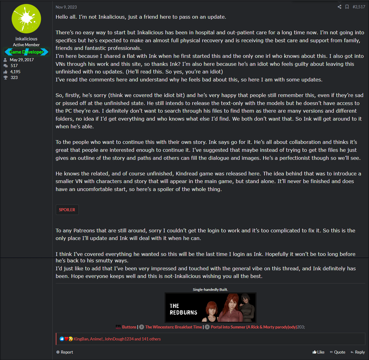 So, I looked into the f95 thread. It seems that Inkalicious is still having problems with his health. Since I can't share f95zone.to links because itch.io doesn't allow it anymore, I share the post as a photo. When you want to read it there, just visit the thread yourself. The post is on page 26.