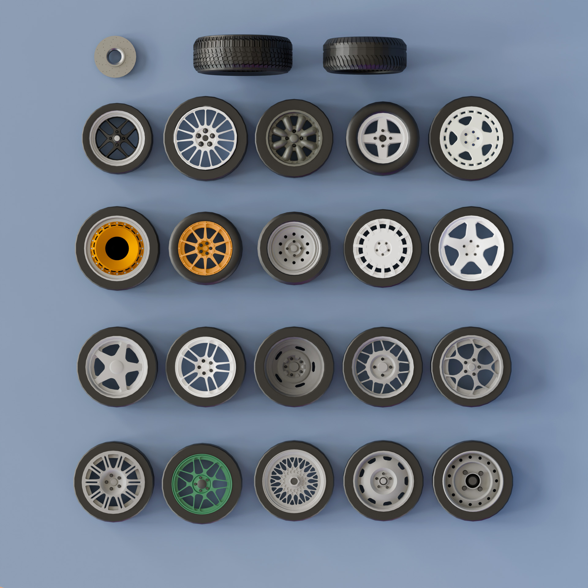 This is a growing collection of low poly wheels and wheel components designed for use in vehicle-based games and prototypes.