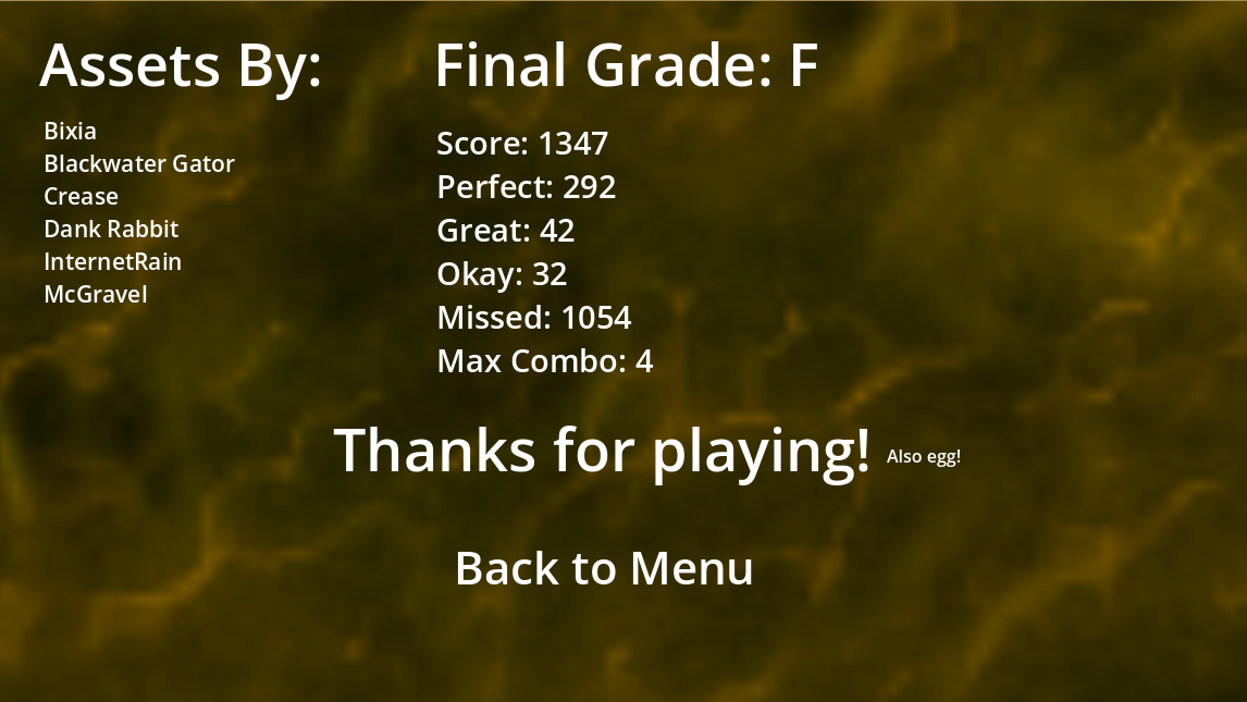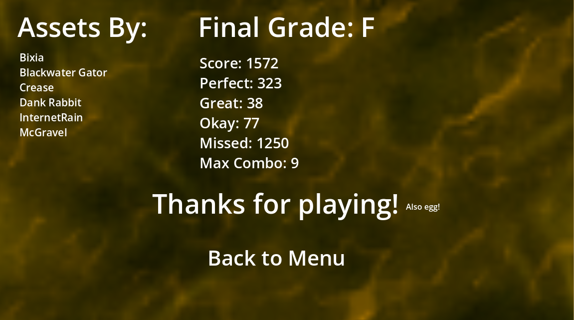 That was an intense gameplay hehe. Maybe I would have lowered the number of hits or chosen a different key input, like D/F/J/K or A/S/D/F and space for the shots, I don't know hehe, or I maybe just can't play the keyboard. Still fun concept! I miss when guitar hero was a thing.
