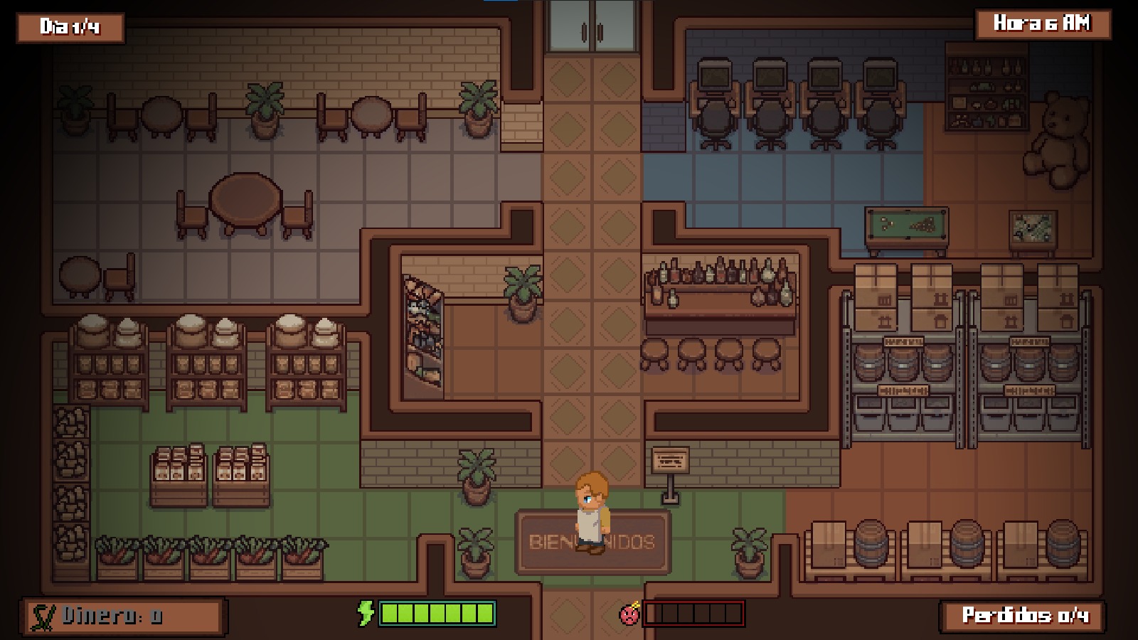Hola, este es el juego que hicimos como equipo. Nos esforzamos demasiado y nos gustaría que lo califiquen. Se trata de Don JC un vendedor de un bazar. Pon a prueba tus reflejos, tu organización y tu capacidad para manejar la presión en este frenético juego donde cada segundo cuenta. Te animamos a sacar todos los finales!!! (son 3)