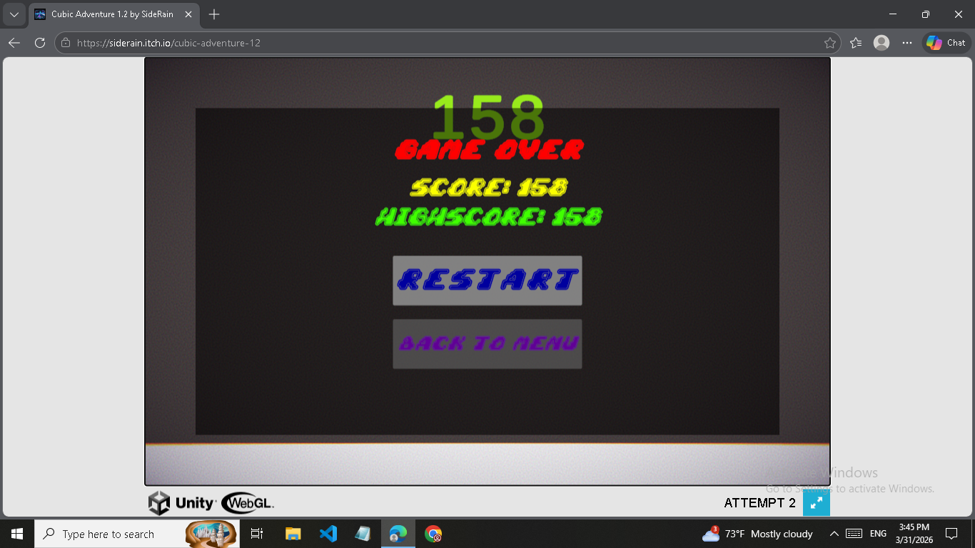 for the gameplay, I don't like how dying launches you straight to the main menu, instead of giving you the option of respawning. The fact that the easy mode comes after the hard mode is prety weird too. The camera angle is too weird, and sometimes is hard to tell if the player will collide with the walls or not (even more when the walls have the same color as the player)