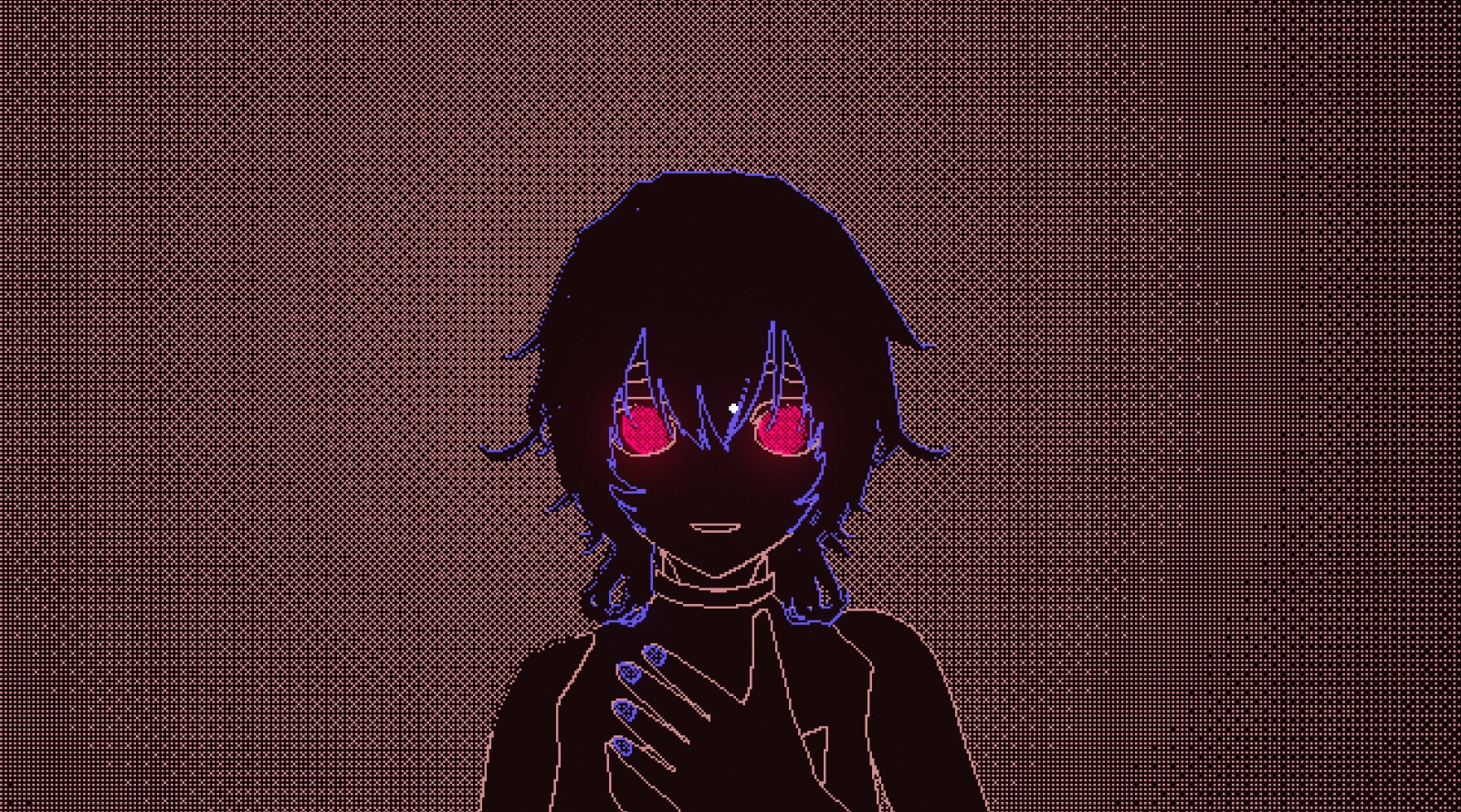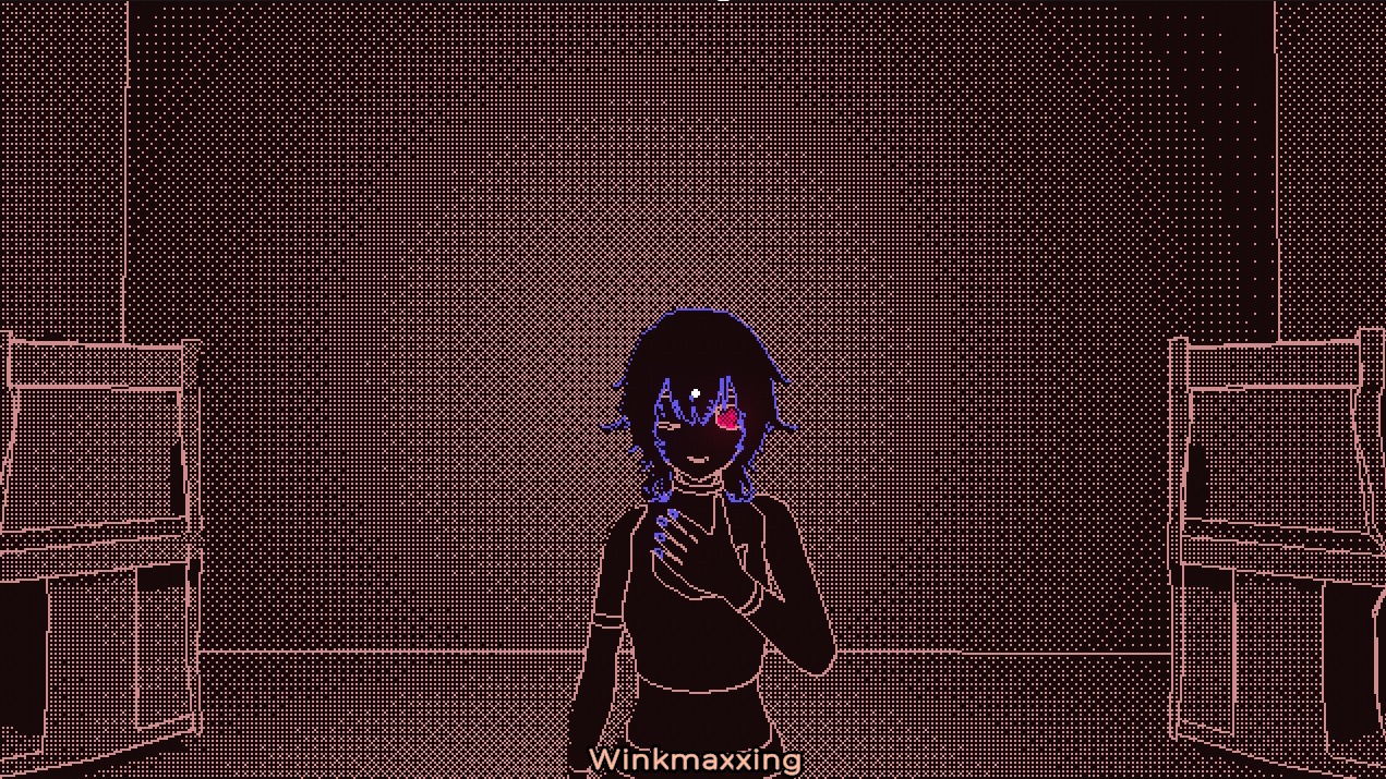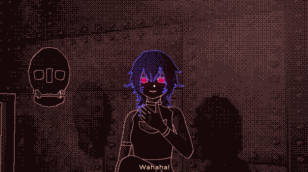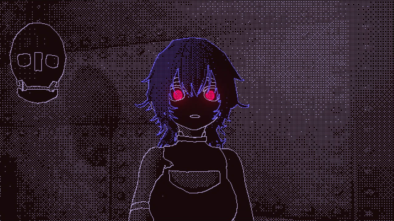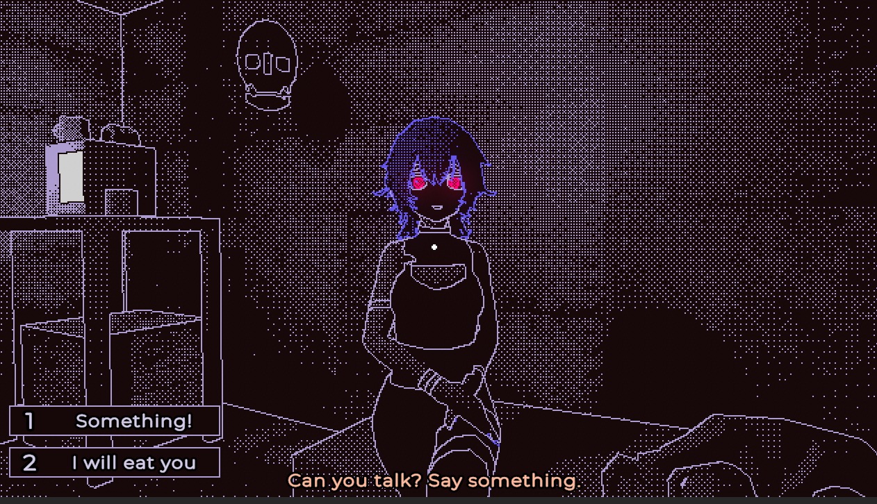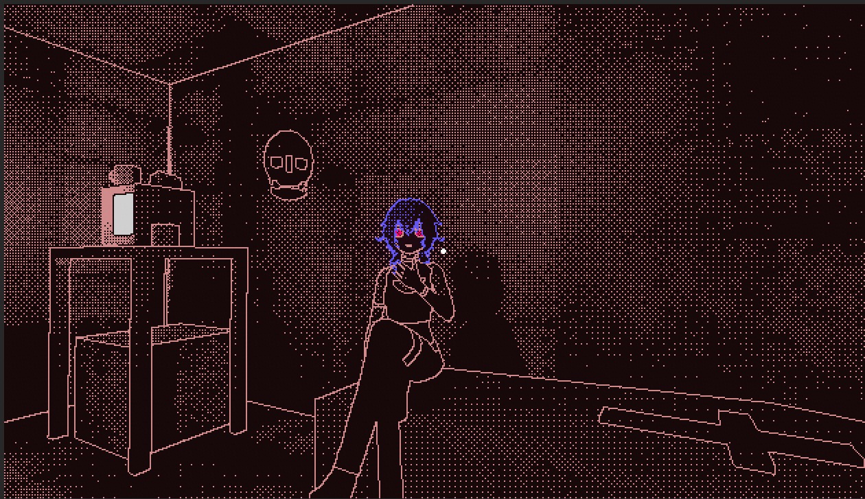 Added colors, anime girl and a base dialogue system. For creating the anime girl I used VROID studio. No choices for dialogues yet. Leaning into a stylized anime look rather than realism like obradinn makes the creation process a lot faster with the 1-bit dithering style. The game itself is not 1-bit anymore with the new colors, but everything is still shaded with only 2 colors per object.