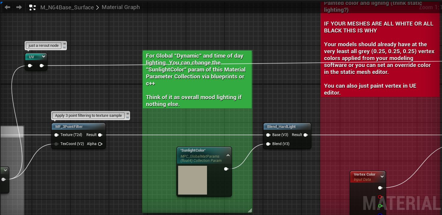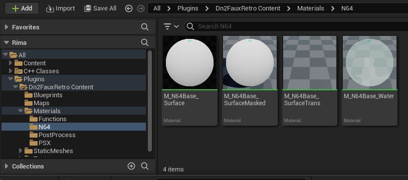 Check out the N64 & PSX Base materials in Dn2FauxRetroContent > Materials and the Material Functions in Dn2FauxRetroContent > Materials > Functions.