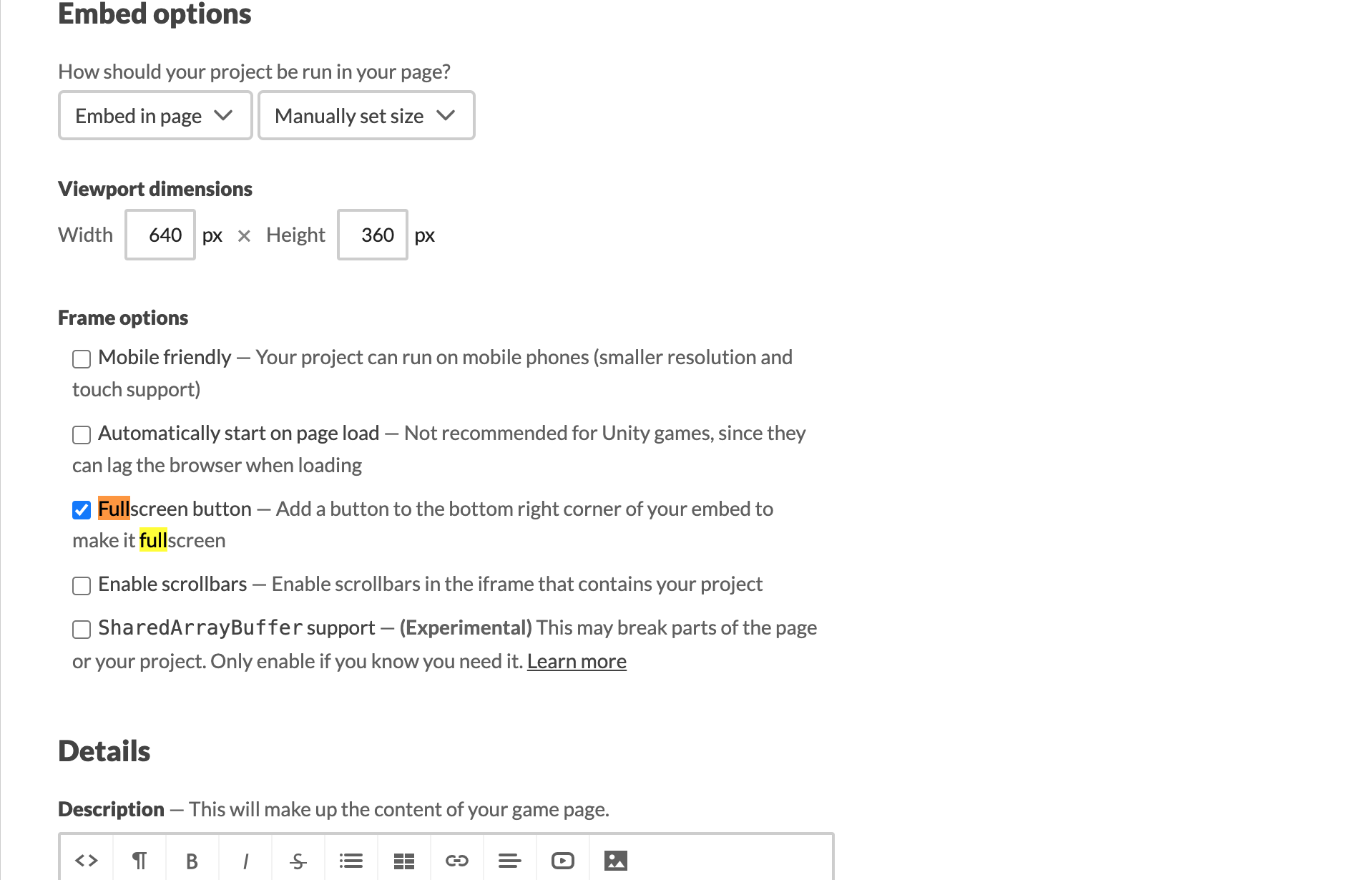 also, idk if u know this already but there's an option in "Edit Project" that allows your game to be played in fullscreen (it's found between "Embed options" and "Details")
