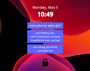 Thanks for the feedback, three of the numbers are real numbers that don’t have a text conversation associated with them, so there is a bit more of an AR experience to it then I intended. I spent most of the jam on the technical aspects of the game as a proof of concept, so in the future I can look at longer messages/music/and the like 👍