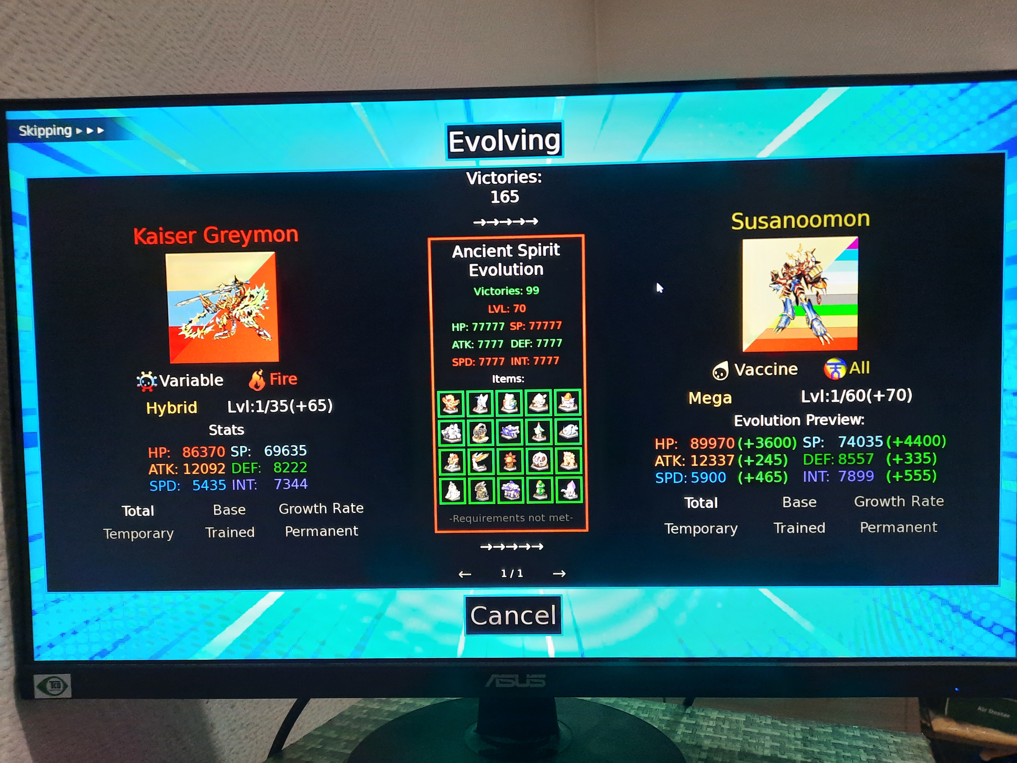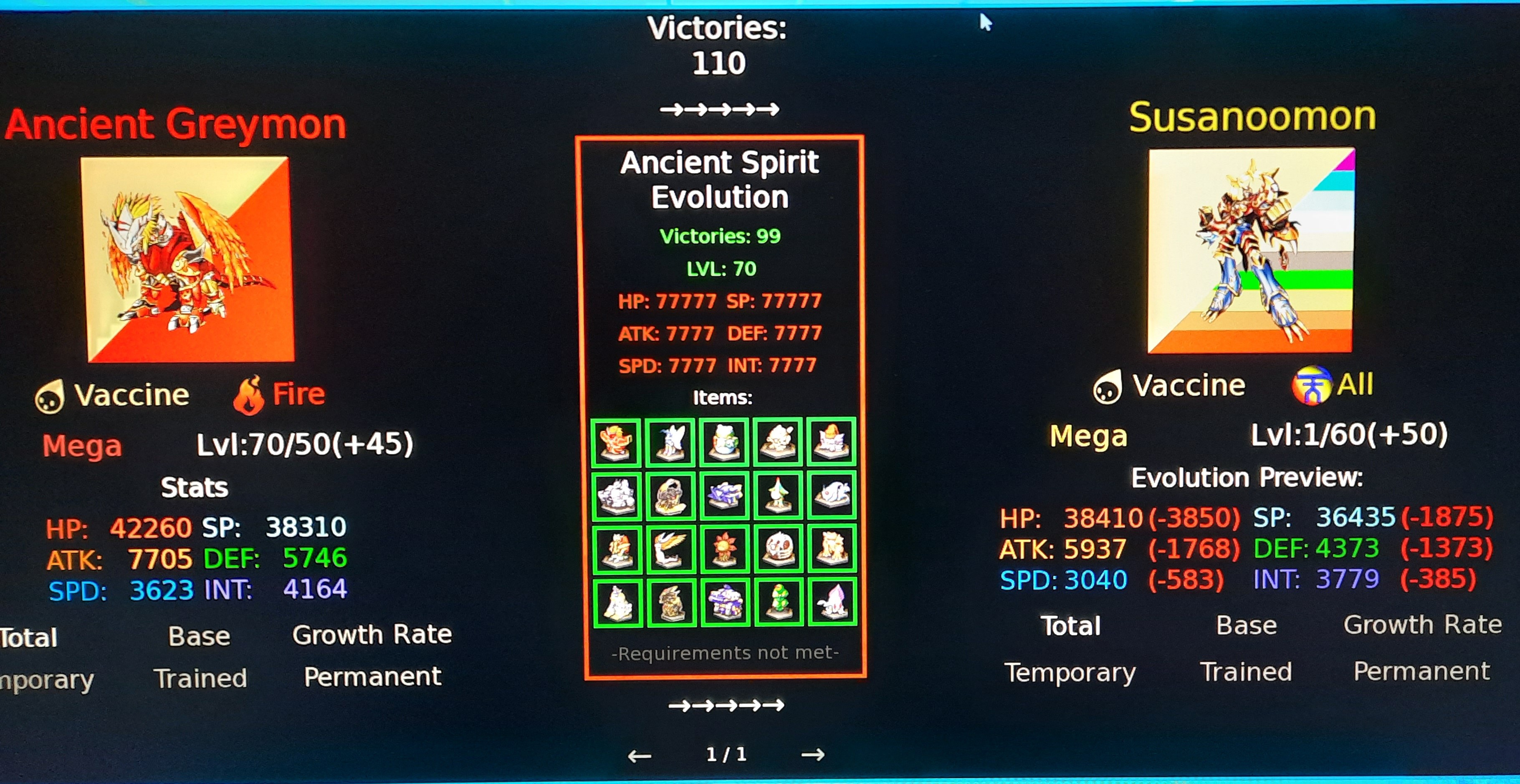 <img src="https://img.itch.zone/aW1nLzI0NzI4MTY4LmpwZw==/original/nqXN53.jpg"><img src="https://img.itch.zone/aW1nLzI0NzI4MTY5LmpwZw==/original/1gItBJ.jpg"><img src="https://img.itch.zone/aW1nLzI0NzI4MTcwLmpwZw==/original/F1E2p%2F.jpg">I've already had a few problems. Is it possible to remove the "Digimon can no longer level up" priority from the tooltips, or to be able to change it in the options? Then I looked at each Digimon, or rather what they drop, in the Digimon Database, and there's an item I can't find that's used to evolve some of them. It looks like a little figure inside a square. Then Kuwagamon grows and evolves into itself, a bit like a form change, but identical. Also, some X-Antibody Digimon no longer de-digivolve into their normal form. Finally, I found that Ragna Lordmon cannot fuse; the two Digimon required for this are considered nonexistent, and their icons during evolution are blurred. And I'd like to add that I apologize for the translation; as English isn't my native language, I used an online translator.<img src="<a href="<a href="https://img.itch.zone/aW1nLzI0NzI4MTMyLmpwZw==/original/fdEDze.jpg">https://img.itch.zone/aW1nLzI0NzI4MTMyLmpwZw==/original/fdEDze.jpg</a>"><a href="https://img.itch.zone/aW1nLzI0NzI4MTMyLmpwZw==/original/fdEDze.jpg</a>">https://img.itch.zone/aW1nLzI0NzI4MTMyLmpwZw==/original/fdEDze.jpg</a></a>"><img src="<a href="<a href="https://img.itch.zone/aW1nLzI0NzI4MTM1LmpwZw==/original/zopXEf.jpg">https://img.itch.zone/aW1nLzI0NzI4MTM1LmpwZw==/original/zopXEf.jpg</a>"><a href="https://img.itch.zone/aW1nLzI0NzI4MTM1LmpwZw==/original/zopXEf.jpg</a>">https://img.itch.zone/aW1nLzI0NzI4MTM1LmpwZw==/original/zopXEf.jpg</a></a>"><img src="<a href="<a href="https://img.itch.zone/aW1nLzI0NzI4MTM3LmpwZw==/original/7uuMUx.jpg">https://img.itch.zone/aW1nLzI0NzI4MTM3LmpwZw==/original/7uuMUx.jpg</a>"><a href="https://img.itch.zone/aW1nLzI0NzI4MTM3LmpwZw==/original/7uuMUx.jpg</a>">https://img.itch.zone/aW1nLzI0NzI4MTM3LmpwZw==/original/7uuMUx.jpg</a></a>">