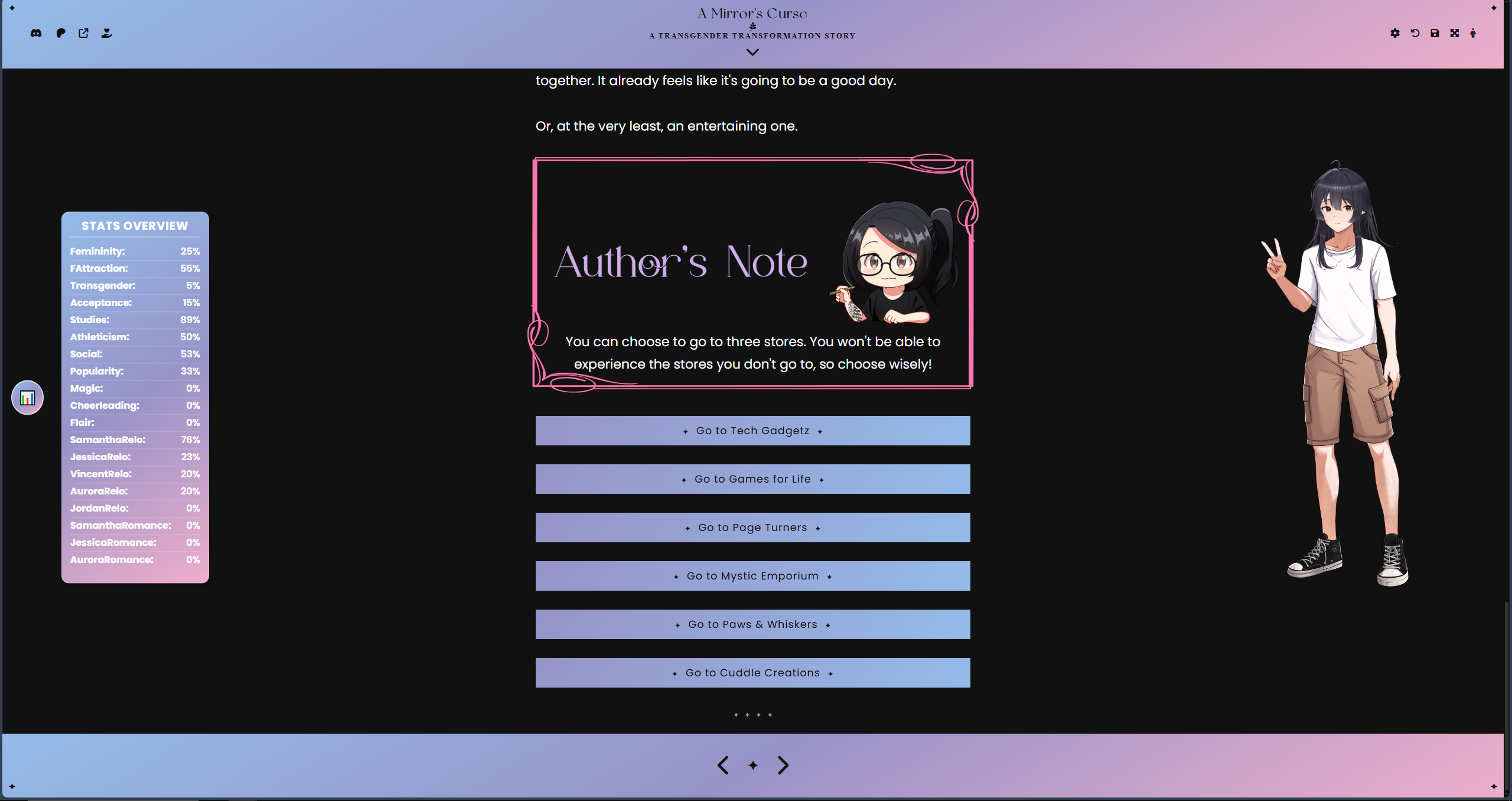 Day 3 released. Discuss magic with Yasmin, she the first effects of the permanent transformation. Meet Elka and Colette. Consider if you should buy a sundress and discuss why with Megan. Suffering with $time code, but hopefully it all works.