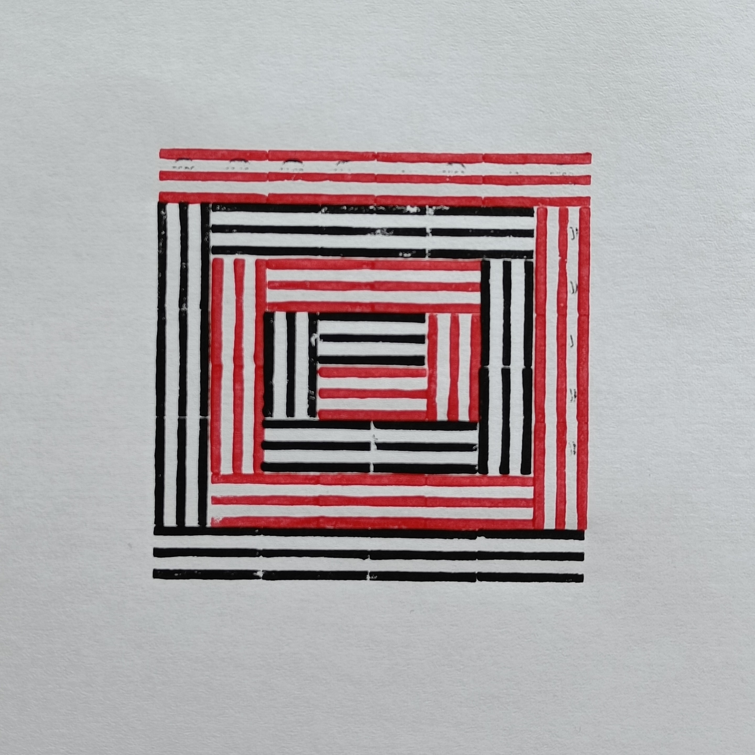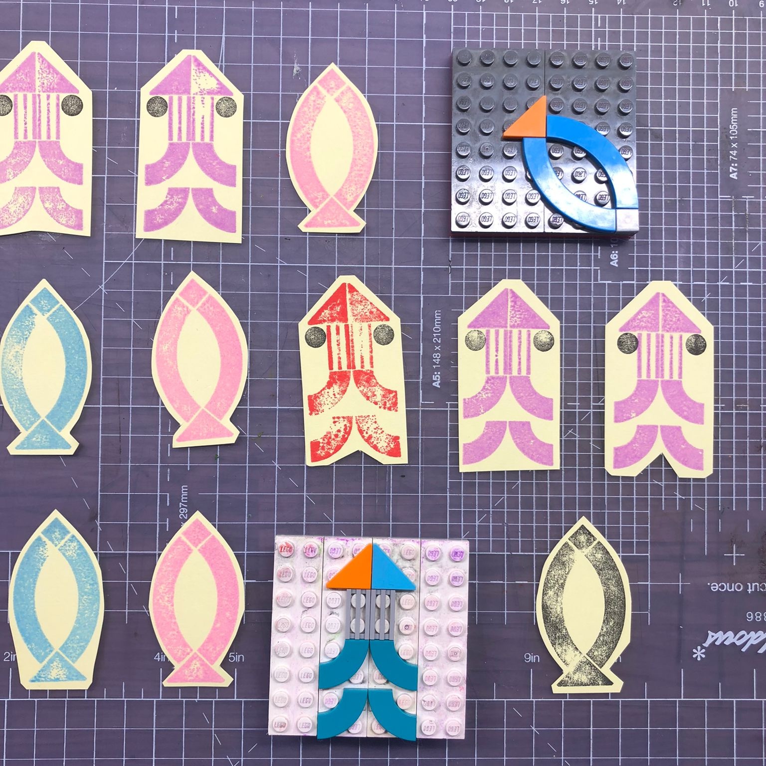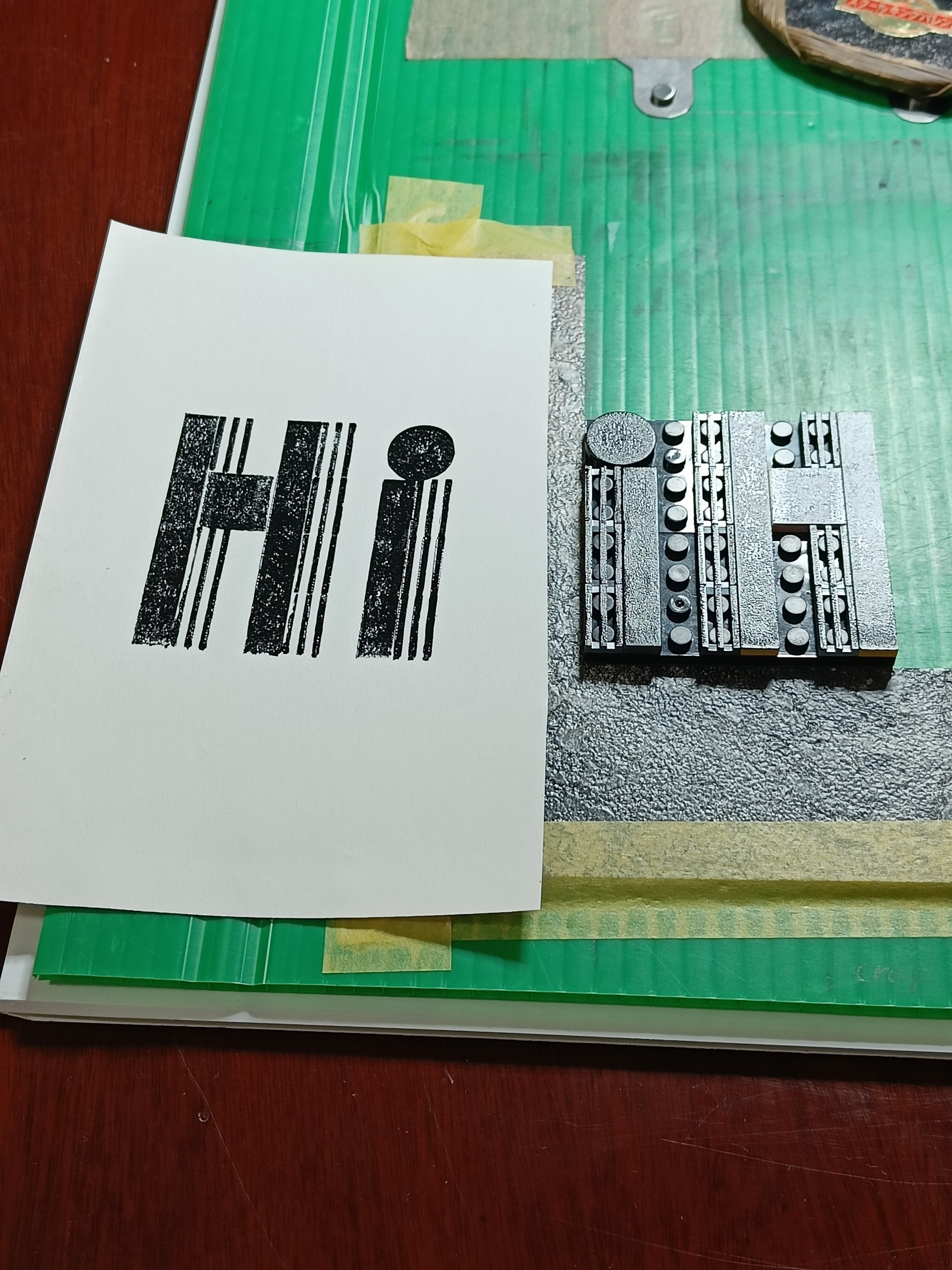 Put a piece of paper down, attached two tabs (here each tab is made of two 2x4 flats: one red, and one grey) to the paper with tape. In the closeup, the nearer “tab” is not quite locked onto the orange plate, but when printing, it should be.