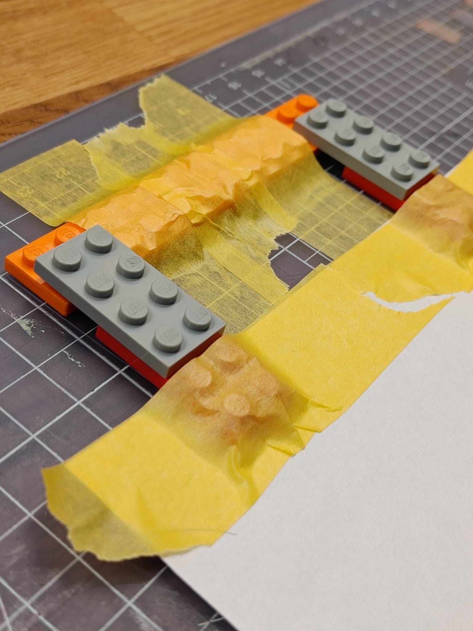 Now you can take the piece of paper away, and as long as you keep the Lego tabs taped to it, it should register perfectly when you reattach it to the orange plate.